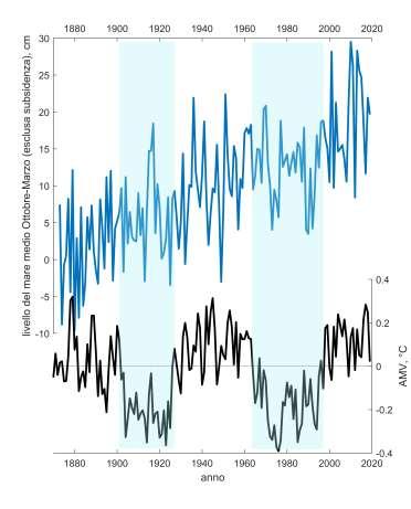 • connessione stabile negli ultimi decenni tra variazioni nel trend del livello del mare a Venezia e nel Nord Atlantico, dove vi è una forte variabilità interdecadale nella temperatura superficiale dell’oceano descritta tramite il fenomeno noto come Atlantic Multidecadal Variability (AMV).