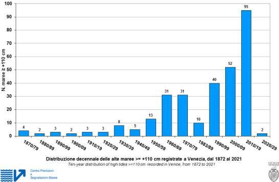Prima della II guerra mondiale le acque alte sopra i 130 cm registrate sono state 2 su 49 occorse (sino al 2020) e di esse ben 42 si sono verificate negli anni successivi al 1978, 16 negli anni dal 2010-2020