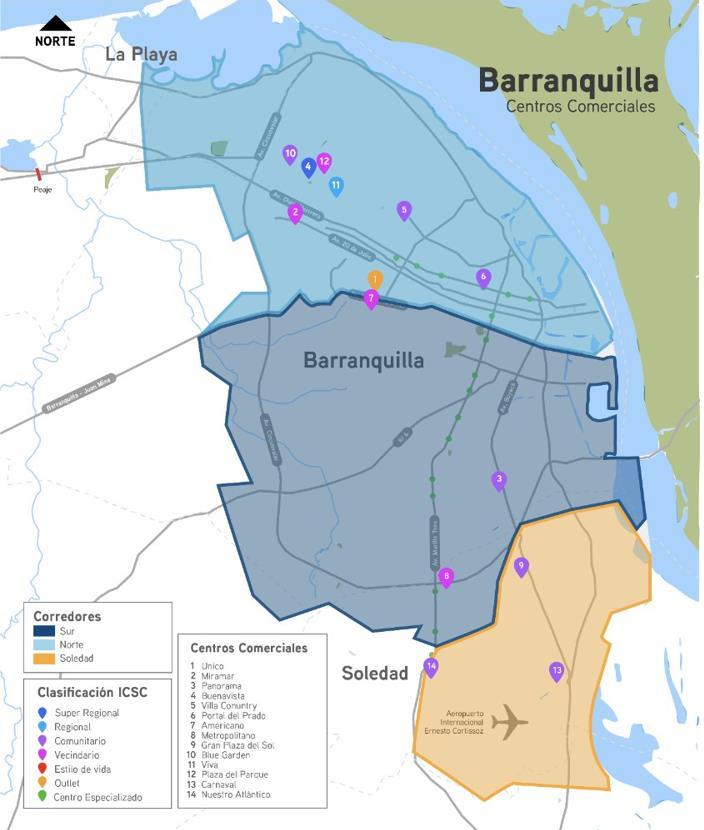 Geográficamente, se encuentra que más del 60% del inventario (260.699 m²) se encuentra ubicado en el corredor Norte y está distribuido en 9 centros comerciales, de los cuales se destacan la tres etapas de Mall Plaza Buenavista y el centro comercial Viva, los cuales aportan 104.021 m² y 62.758 m², siendo estos los de mayor superficie en toda la ciudad. Por otro lado, el corredor Sur aporta un total de 98.971 m², constituido por cuatro centros comerciales donde se destacan el Parque Alegra y Panorama por contar con superficies mayores a los demás. Por último, el corredor Soledad aporta 16,02% al total de GLA de la ciudad y cuenta con tres centros comerciales, entre los que se incluyen Gran Plaza Del Sol y Nuestro Atlántico, los ofrecen una variedad de servicios y un tenant mix robusto.