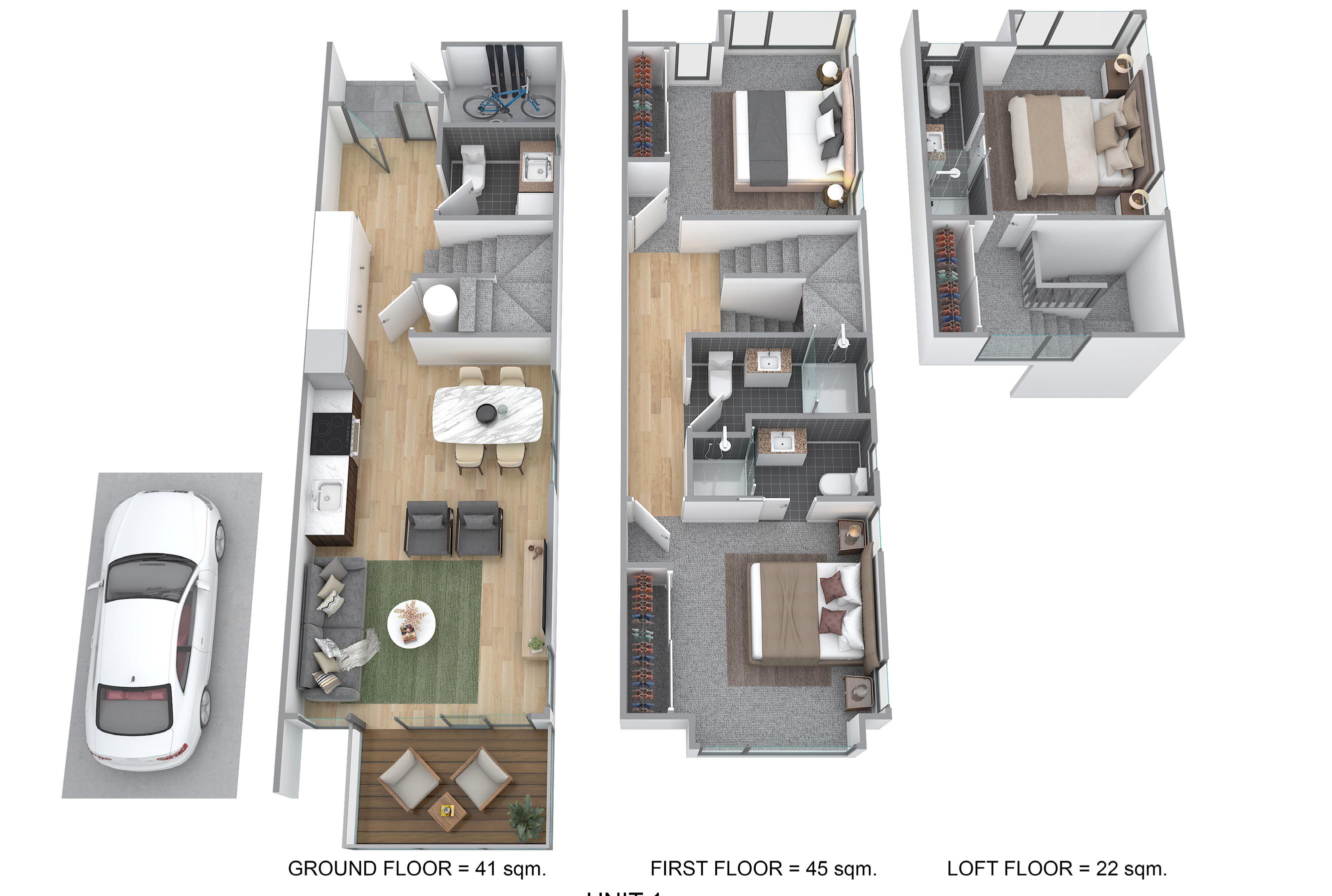 Each villa features three spacious bedrooms, 3.5 elegantly designed bathrooms, a dedicated off-street car park, and a generous storage cupboard—ensuring ample space for families, holidaymakers, and investors alike. Premium finishes, including stone benchtops, designer kitchens, tiled bathrooms, and high-end appliances, set a new benchmark for quality. The master suite offers a private retreat, while the secondary bedrooms provide an ideal haven for guests or family members.