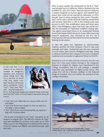 in the Cold War. It is a veteran of an unknown number of dangerous missions over mainland China hiding from Mig 17s; a survivor of secret Cold War aerial combat! The five CAT B-17Gs were numbered “739”, “357”, “815” and “835” and “639”(Evergreen’s B-17). During these dangerous missions three were shot down by the PLAAF or PLA (People’s Liberation Army Air Force).