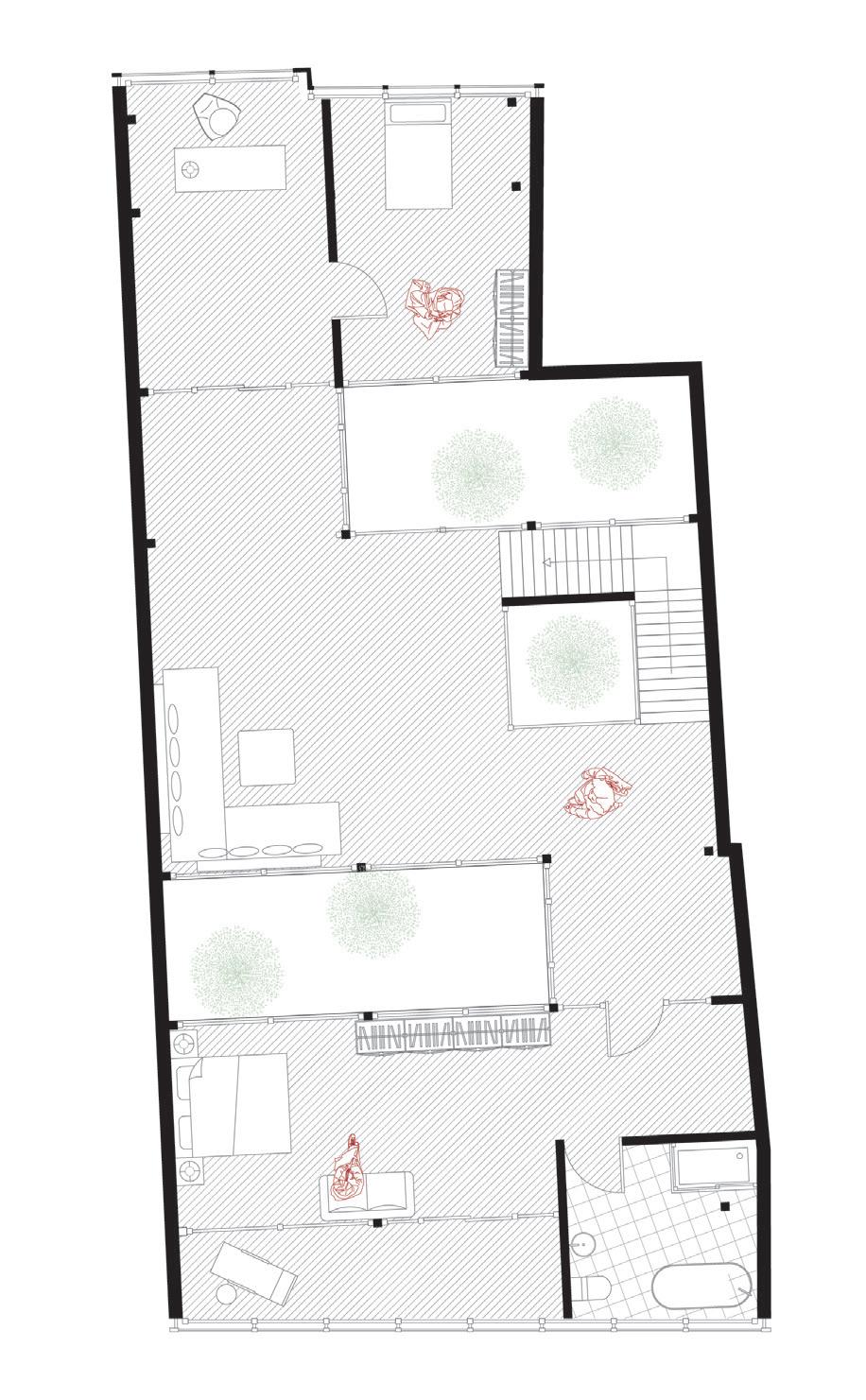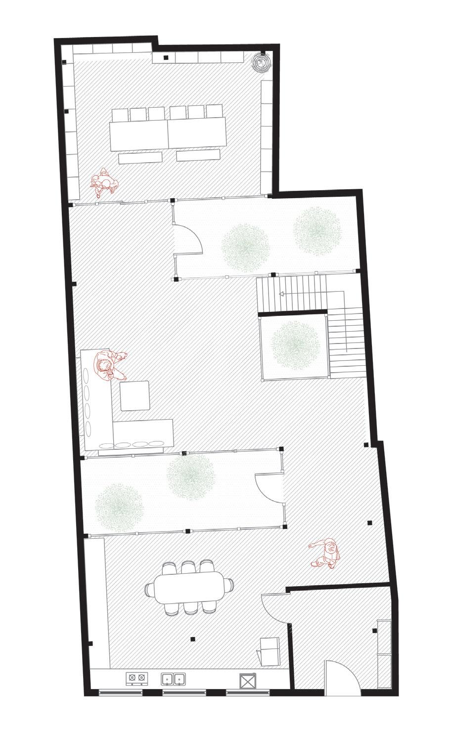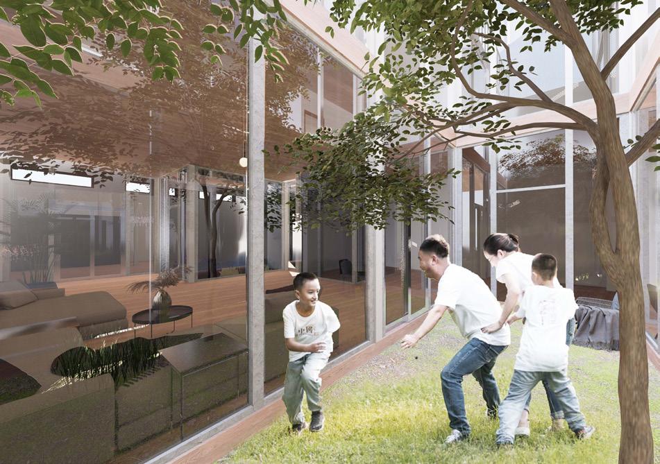 Gound floor is mainly use for public function, including open kitvhen, living room and tea room. An interior rectangle courtyard is interspersed throughout the rooms and providing naure light. Children can play in it and adults can glab a chair and sit there just read books and still keep childern in thrie sight.