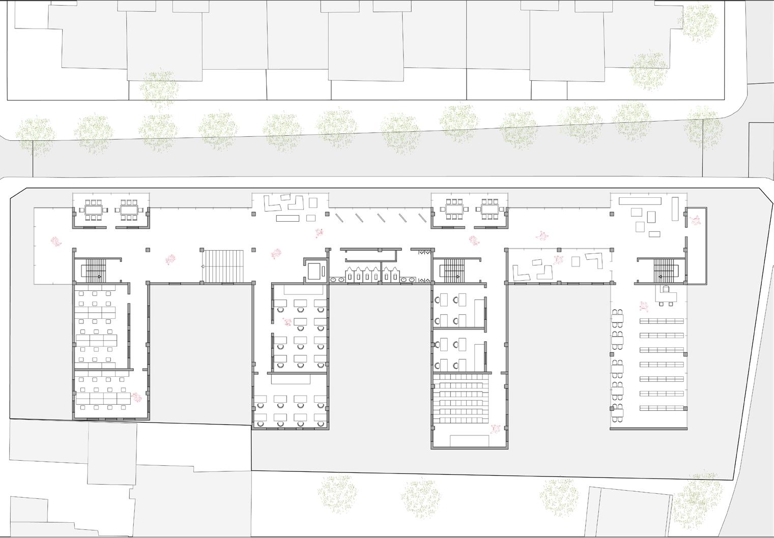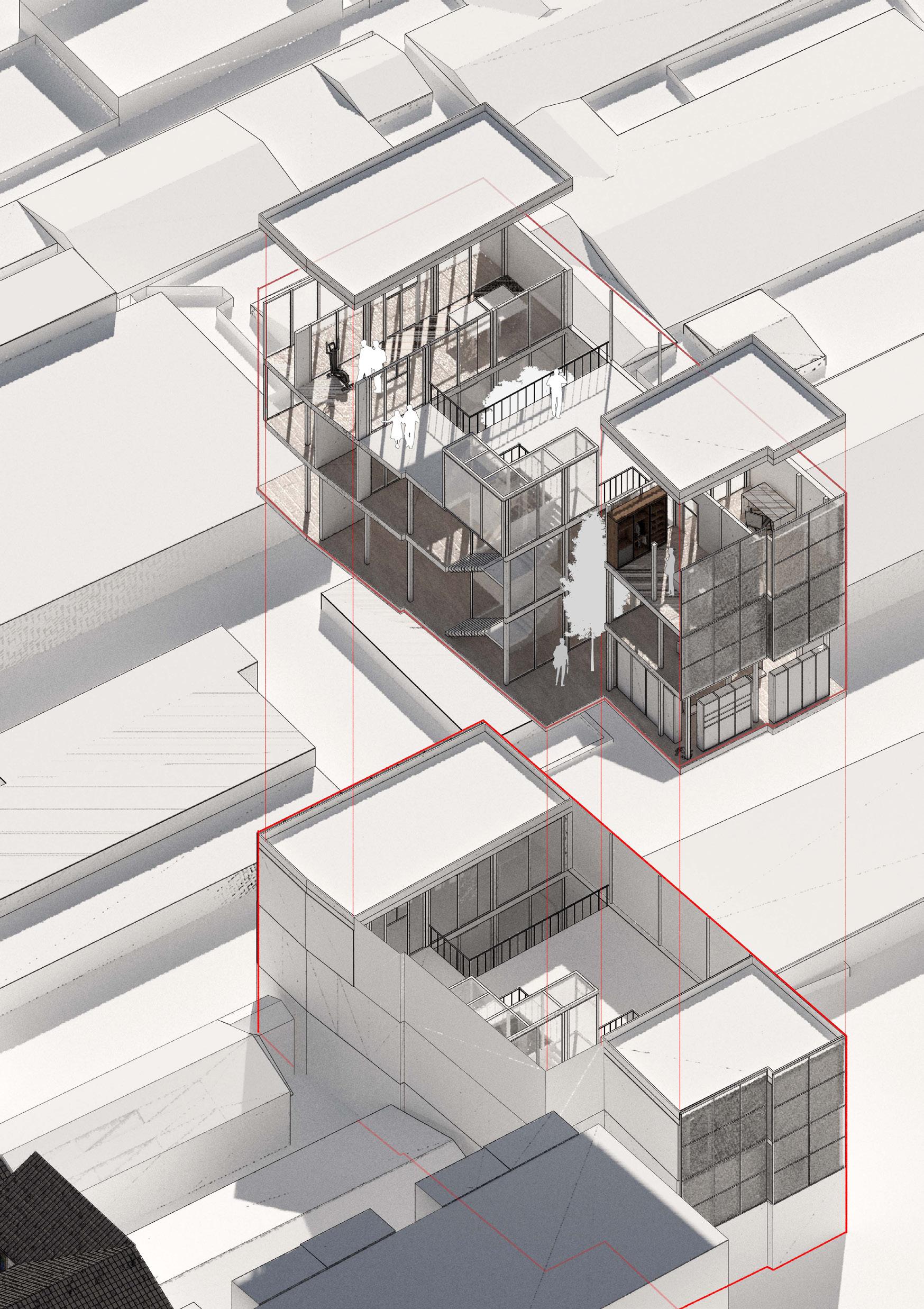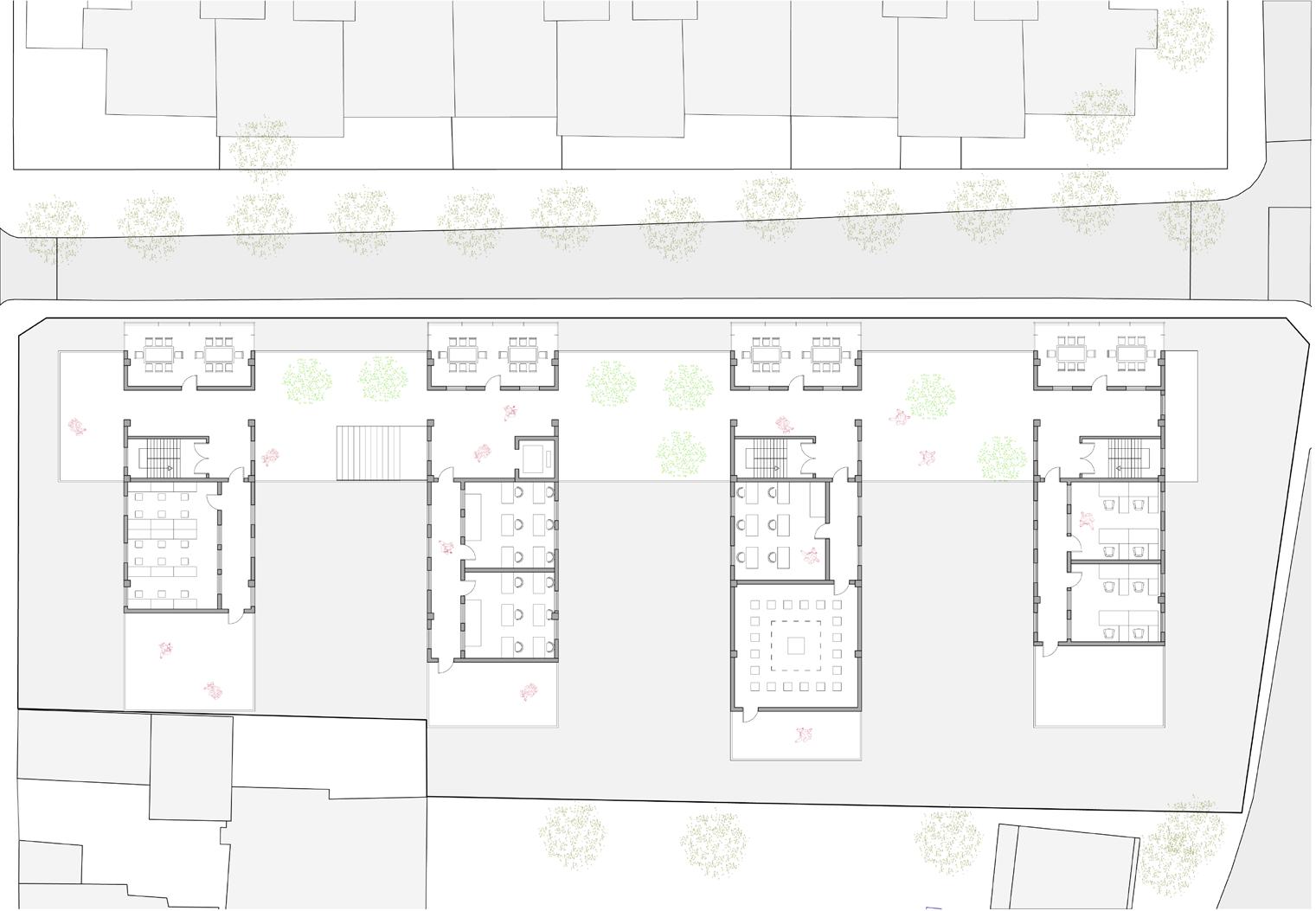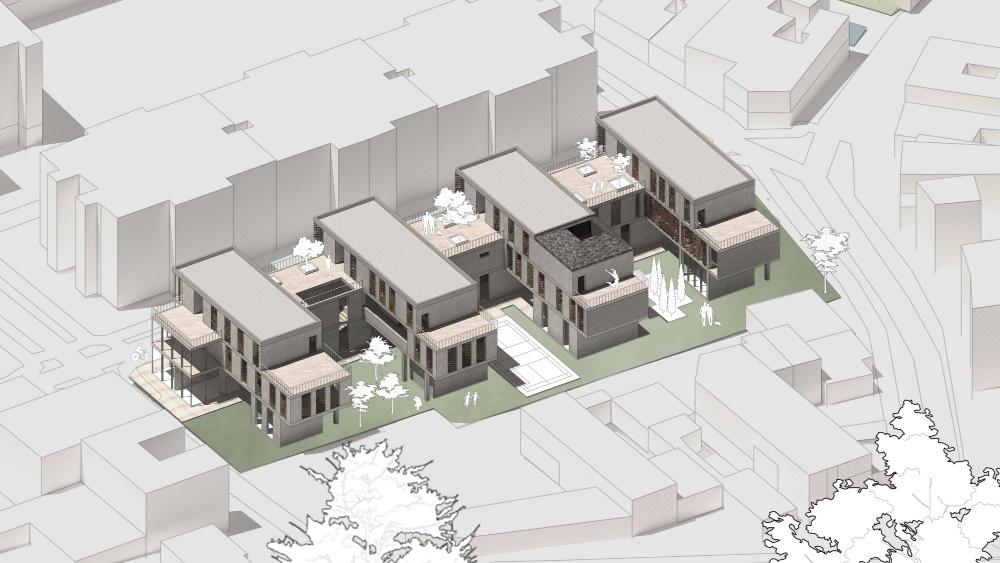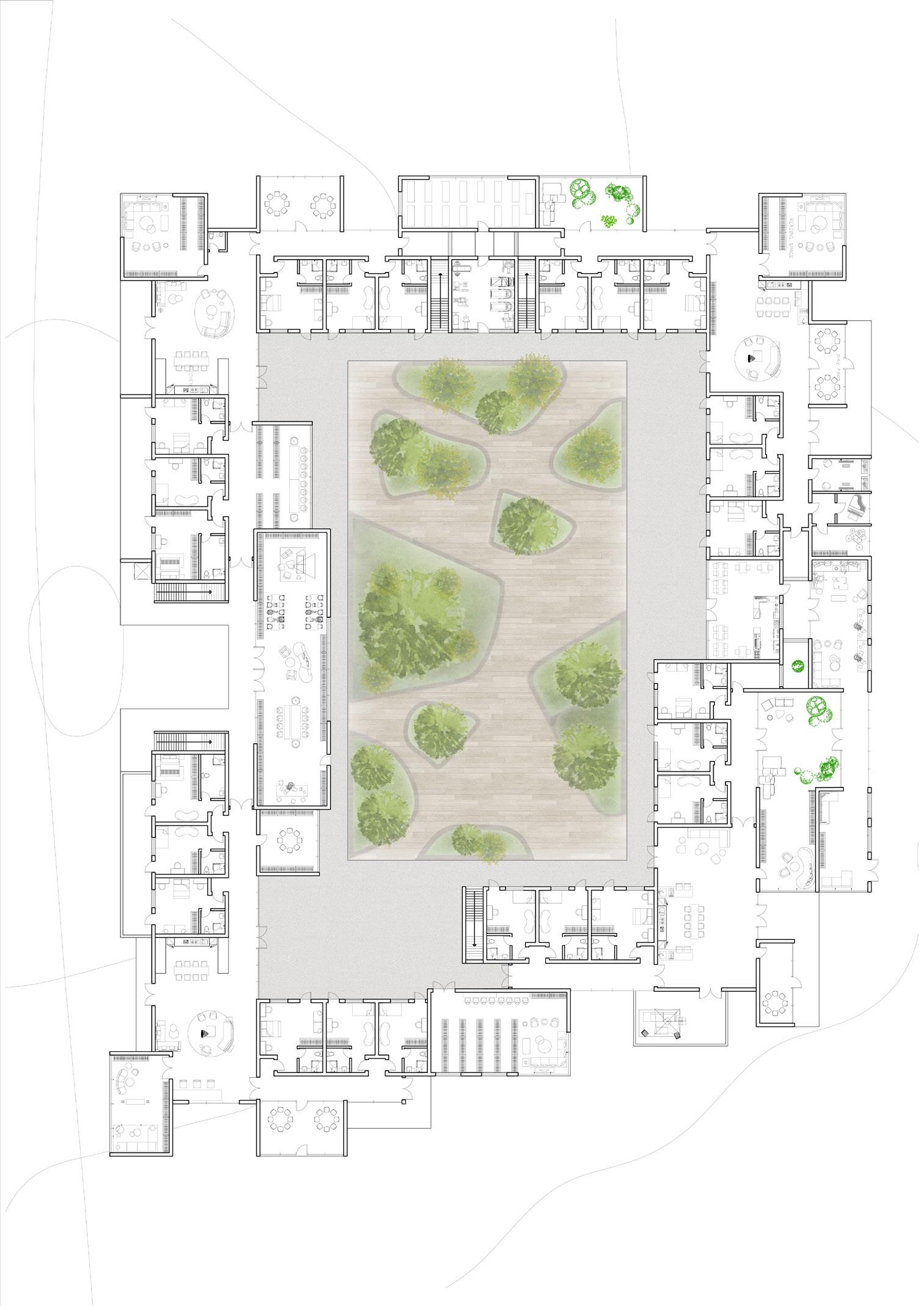 The architectural design of this co-living housing for elderly people features thoughtfully arranged L-shaped units that create a strong sense of community. Each unit provides private living quarters, seamlessly opening onto shared courtyards and gardens, fostering social interaction and a sense of belonging among residents. The L-shaped configuration not only ensures ample natural light and ventilation but also enhances accessibility and safety. Communal spaces, including lounges, dining areas, and activity rooms, are strategically placed to encourage frequent gatherings and engagement, promoting a supportive and vibrant living environment where elderly residents can thrive together.