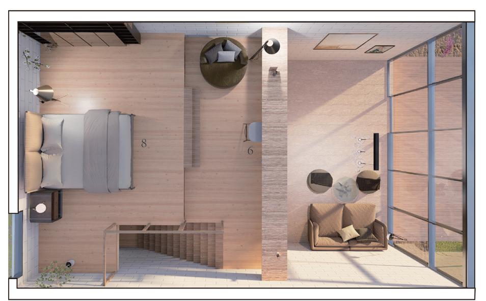 This house is designed for a young painter who lives alone. The most important element for a painter is the light. The overall design enhances the ability of natural light to enter the entire residence through a glass wall. It is also the main source of natural light inside the building. The interior is designed to give all rooms a coherent view and thus make the view wider. The design symbolizes the boundary of a painter's level, that is, the change of level and height will act as an invisible boundary, unified with each other. The interior space is divided by furniture rather than walls. The flexibility of its use allows the design to adapt to the changing needs of residents. At the same time, in order to realize the space required for the painter to display his paintings, a 5-meter-high ceiling is the most suitable.