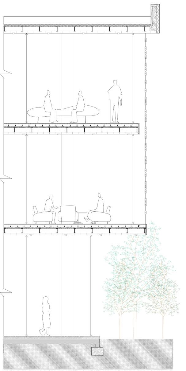 Creates a semi-open space that offers views outwards and privacy to a certain extent. Light can be absorbed through the void and some noise can be isolated.