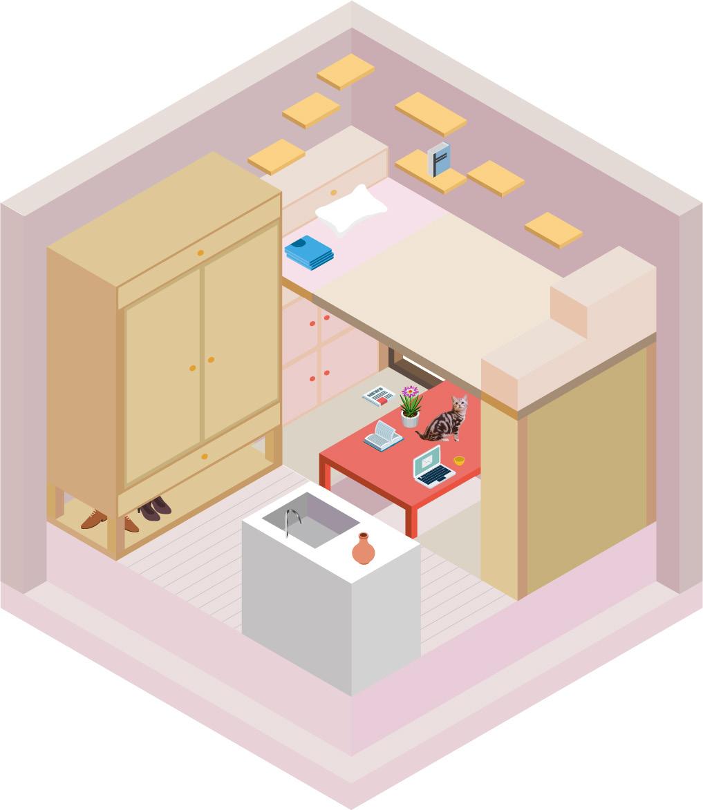 This minimal dwelling is designed for a person and its cat. What a cat needs are a place to sleep, a place to eat and a place to play. What people need is a place for them to work privatly. The working spcae is separated from sleeping space and lifted up to creat private spacce from cat. The floor could be open for storage cause cats might learn how to open the drawers on the closet. The table could be raised down and the whole working place become a bed in case the cat is too annoying.