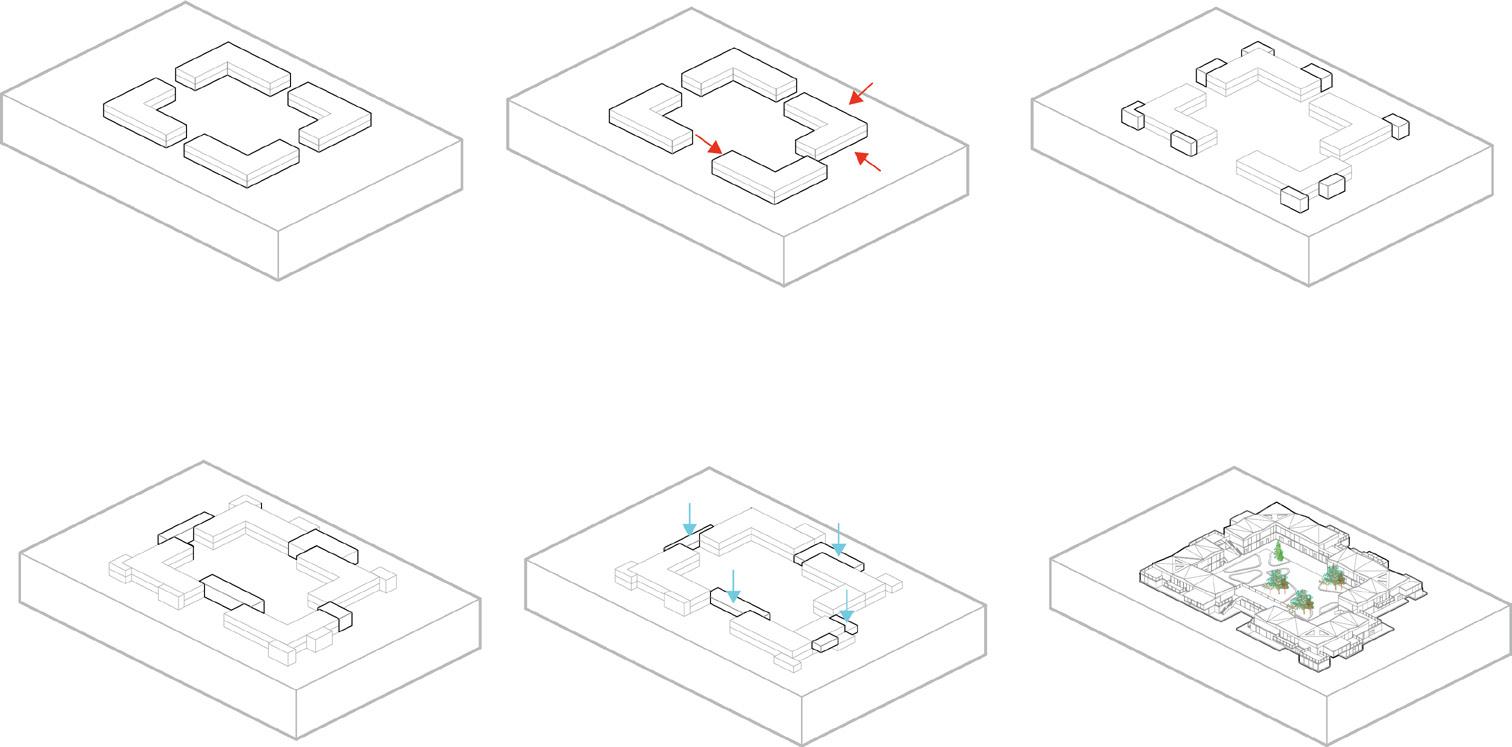 Sequential Diagram Create Shape O set Path Center Library 1. Corridor 2. Single person Bedroom 3. Living Room 4. Kitchen 5. Two people Bedroom 6.Entrance Greenery Add Center Garden Add Entrance Overall 3d Isometric Program Typical Pod Program 1 2 5 6 6 2 2 3 4