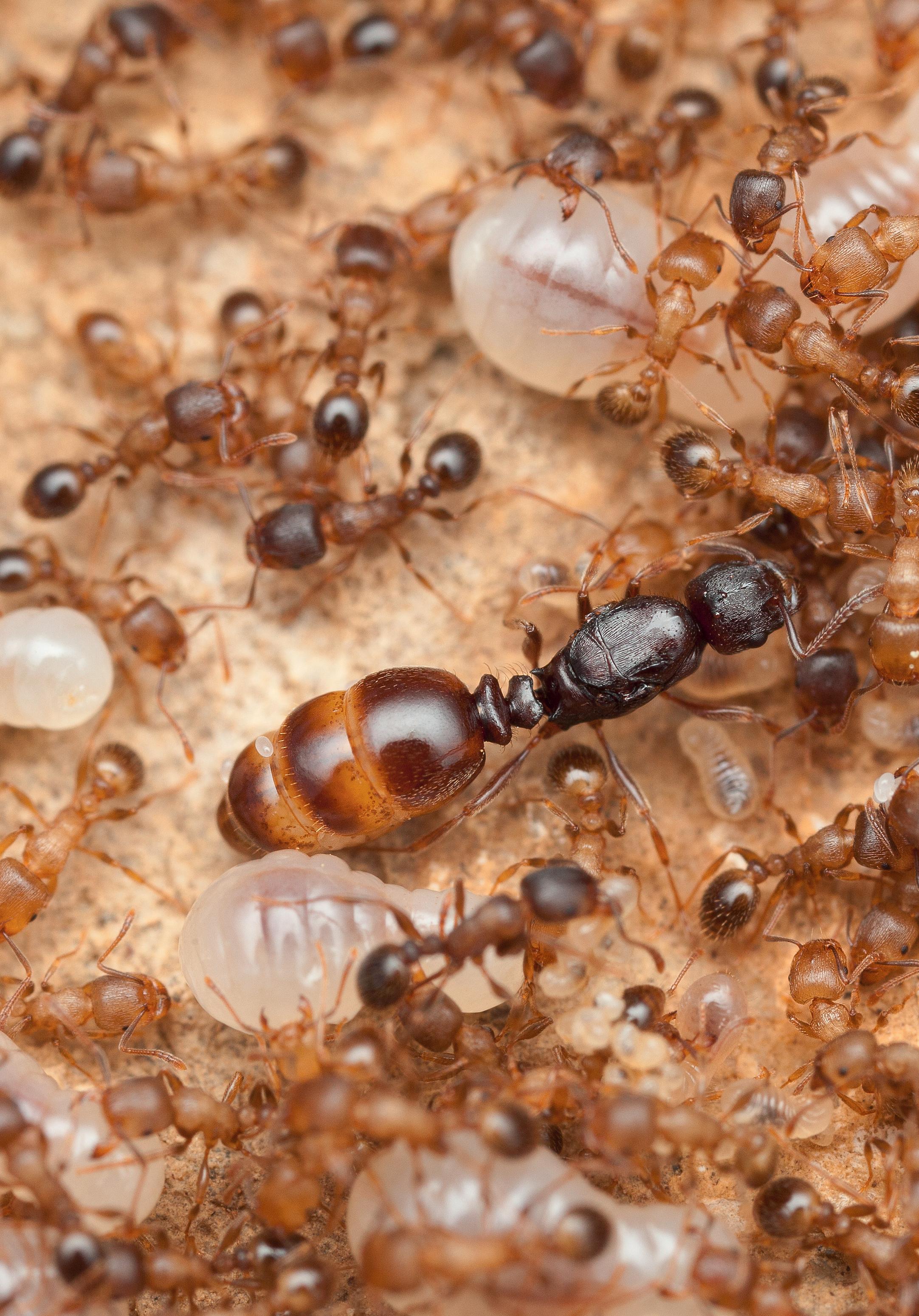 In this crowded ants’ nest, there is one queen. All the eggs come from her.