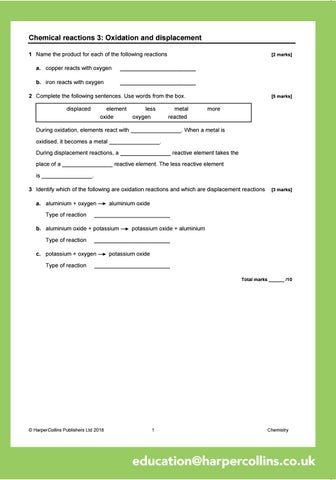During oxidation, elements react with ________________. When a metal is oxidised, it becomes a metal ________________. During displacement reactions, a ________________ reactive element takes the place of a ________________ reactive element. The less reactive element is ________________. 3 Identify which of the following are oxidation reactions and which are displacement reactions a. aluminium + oxygen Type of reaction