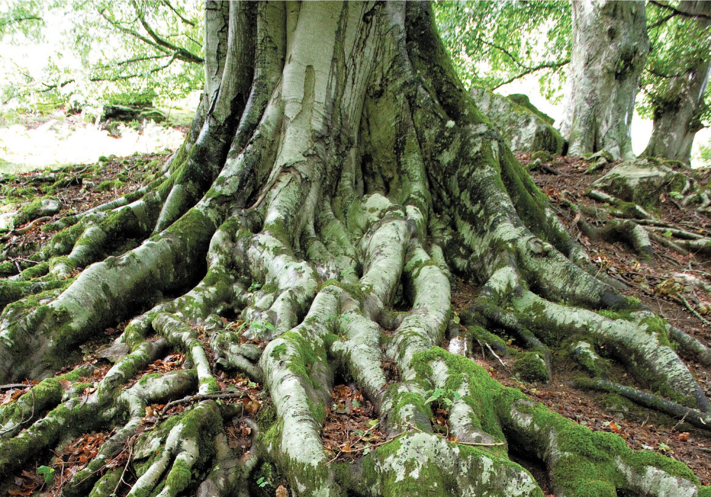 Δ The roots of this tree have grown away from the trunk in order to access the highest quantities of nutrients, which are most plentiful in the top layers of soil.