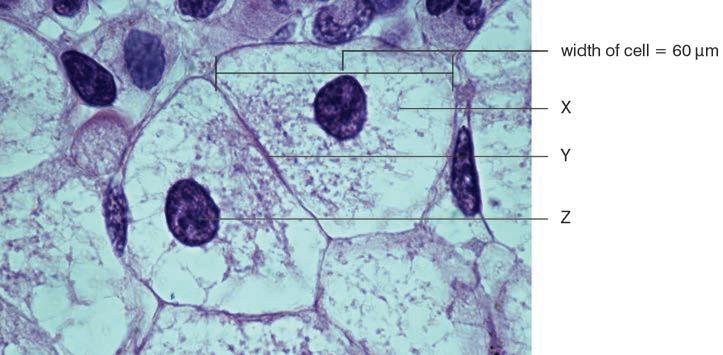 c) SUPPLEMENT Calculate how many liver cells of width 60 µm, laid side-to-side, there would be in a piece of liver tissue 1 cm across. Show your working. (3)
