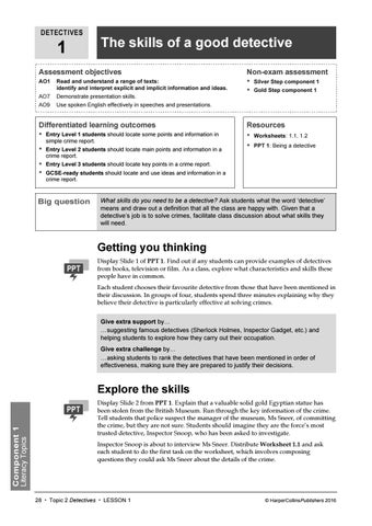 What skills do you need to be a detective? Ask students what the word ‘detective’ means and draw out a definition that all the class are happy with. Given that a detective’s job is to solve crimes, facilitate class discussion about what skills they will need.