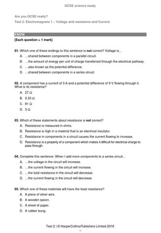 KNOW [Each question = 1 mark] 01. Which one of these endings to this sentence is not correct? Voltage is... A. …shared between components in a parallel circuit. B. …the amount of energy per unit of charge transferred through the electrical pathway. C. …also known as the potential difference. D. …shared between components in a series circuit. 02. A component has a current of 3 A and a potential difference of 9 V flowing through it. What is its resistance? A. 27 Ω B. 0.33 Ω C. 81 Ω D. 3 Ω 03. Which of these statements about resistance is not correct? A. Resistance is measured in ohms. B. Resistance is high in a material that is an electrical insulator. C. Resistance in components in a circuit causes the current flowing to increase. D. Resistance is a property of a component which makes it difficult for electrical charge to pass through. 04. Complete this sentence: When I add more components to a series circuit... A. …the voltage in the circuit will increase. B. …the current flowing in the circuit will increase. C. …the total resistance in the circuit will decrease. D. …the current flowing in the circuit will decrease. 05. Which one of these materials will have the least resistance? A. A piece of silver wire. B. A wooden spoon. C. A sheet of paper. D. A rubber bung.