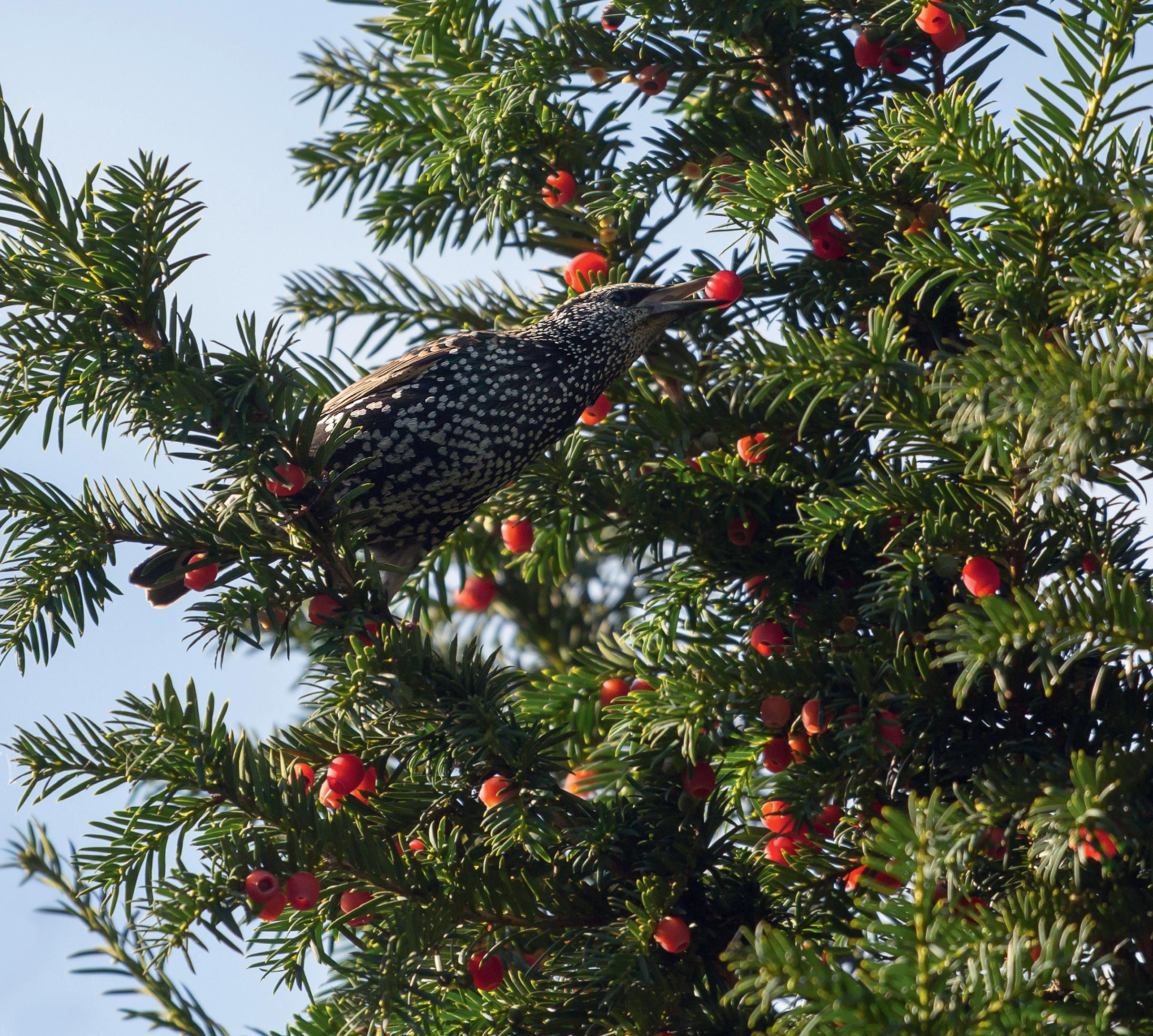 The scarlet seeds of this tree are toxic for us. But they do not harm starlings. Starlings love to swoop down and grab them.