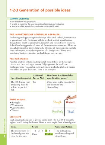 1.2.3 Generation of possible ideas LEARNING OBJECTIVES By the end of this unit you should: ✓ be able to recognise the need for continual appraisal and evaluation ✓ be able to relate appraisal and evaluation to the specification.