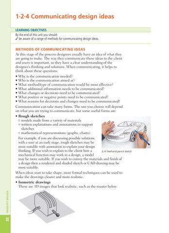 METHODS OF COMMUNICATING IDEAS At this stage of the process designers usually have an idea of what they are going to make. The way they communicate these ideas to the client and users is important, so they have a clear understanding of the designer’s thinking and solutions. When communicating, it helps to think about these questions: • Why is the communication needed? • Who is the communication aimed at? • What method/type of communication would be most effective? • What additional information needs to be communicated? • What changes or decisions need to be communicated? • What positive or negative points need to be communicated? • What reasons for decisions and changes need to be communicated? Communication can take many forms. The one you choose will depend on what you are trying to communicate, but some useful forms are: • Rough sketches ● models made from a variety of materials ● written explanations and annotations to support sketches ● mathematical representations (graphs, charts). For example, if you are discussing possible solutions with a user at an early stage, rough sketches may be most suitable with annotation to explain your design thinking. If you wish to explain to the client how a ∆ A freehand pencil sketch mechanical function may work in a design, a model may be more suitable. If you wish to convey the materials and finish of a design then a rendered and shaded sketch or CAD drawing may be most suitable. When ideas start to take shape, more formal techniques can be used to make the drawings clearer and more realistic. • Isometric drawings These are 3D images that look realistic, such as the toaster below: