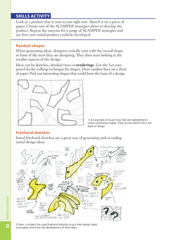SKILLS ACTIVITY Look at a product that is near to you right now. Sketch it on a piece of paper. Choose one of the SCAMPER strategies above to develop the product. Repeat the exercise for a range of SCAMPER strategies and see how your initial product could be developed. Random shapes When generating ideas, designers initially start with the overall shape or form of the item they are designing. They then start looking at the smaller aspects of the design. Ideas can be sketches, detailed views or renderings. Use the ‘Let your pencil do the walking’ technique for shapes. Draw random lines on a sheet of paper. Pick out interesting shapes that could form the basis of a design.