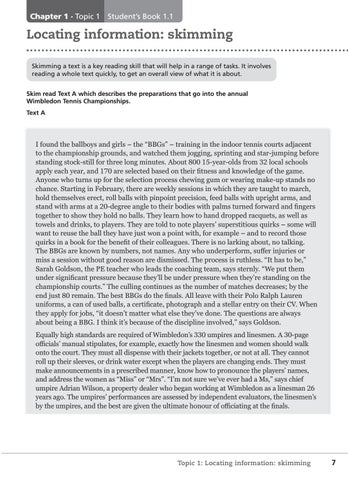 Locating information: skimming Skimming a text is a key reading skill that will help in a range of tasks. It involves reading a whole text quickly, to get an overall view of what it is about. Skim read Text A which describes the preparations that go into the annual Wimbledon Tennis Championships. Text A