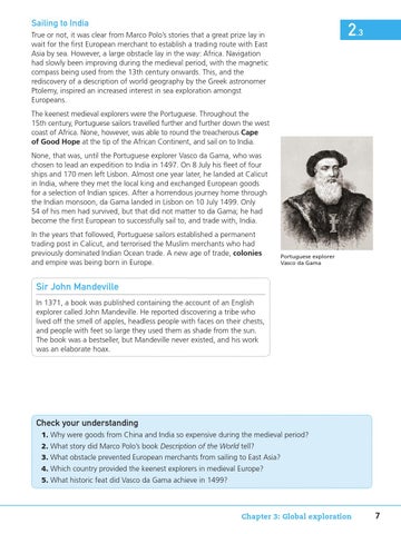 Check your understanding 1. Why were goods from China and India so expensive during the medieval period? 2. What story did Marco Polo’s book Description of the World tell? 3. What obstacle prevented European merchants from sailing to East Asia? 4. Which country provided the keenest explorers in medieval Europe? 5. What historic feat did Vasco da Gama achieve in 1499?