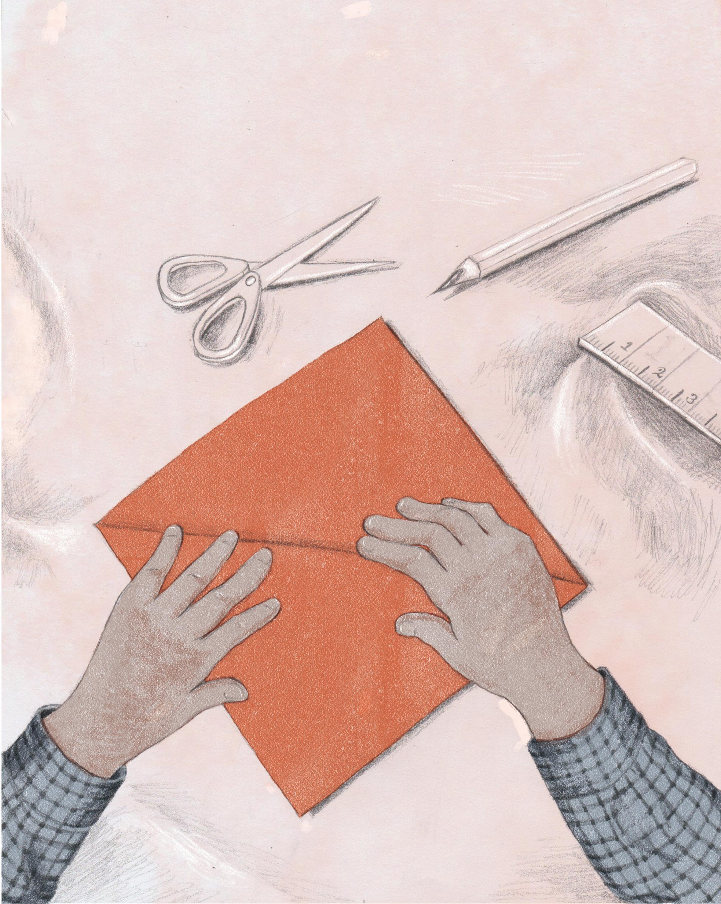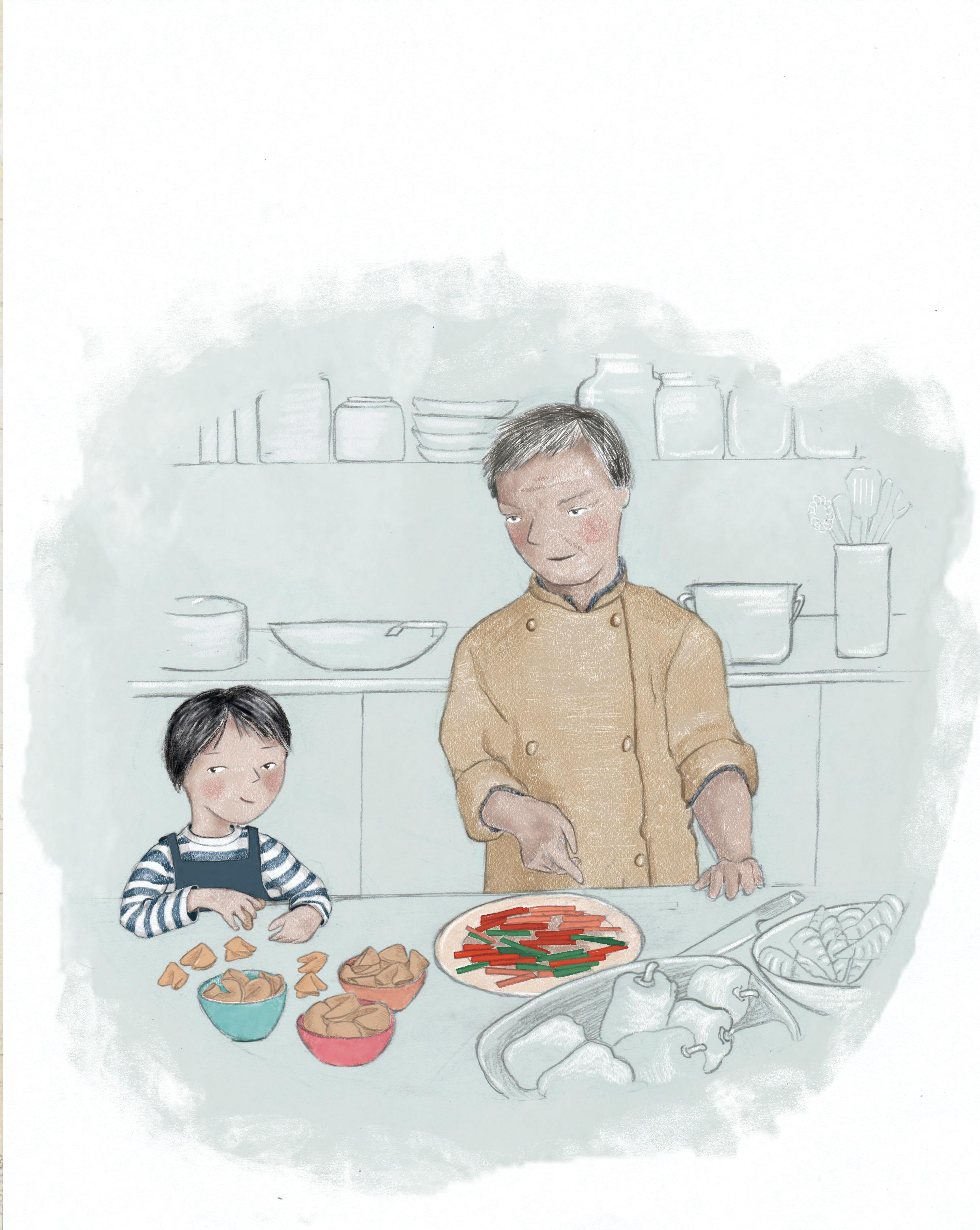 Minmin was sorting the fortune cookies for that evening. Grandad was cutting peppers and carrots into little shapes on a plate.