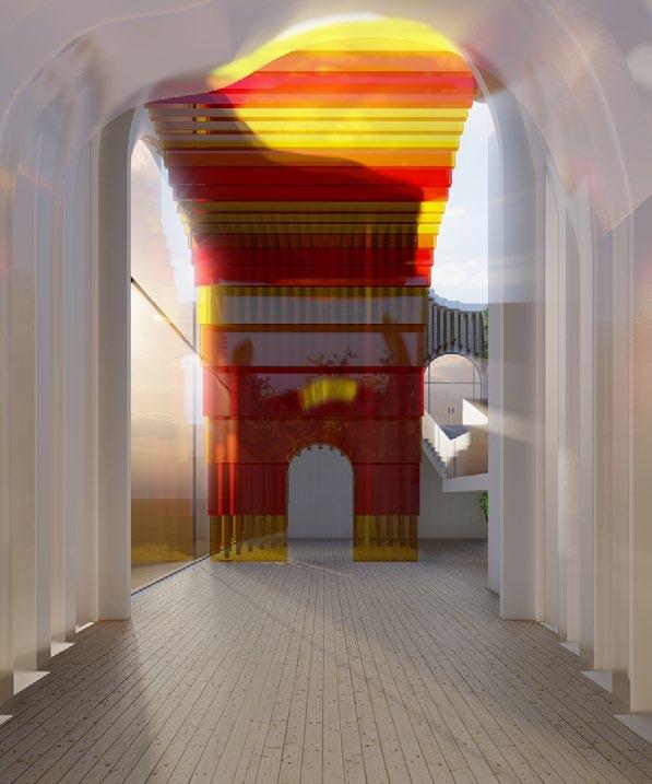 Rendered in Lumion and photoshop. Throughout the center, digital displays light up hallways and provide a unique user experience. The displays are custom with an arched profile and showcase relics, including mummified remains. The gallery halls highlight the projection feature, changing the architecture within an empty room, bringing to life a multifaceted view of reliquaries.