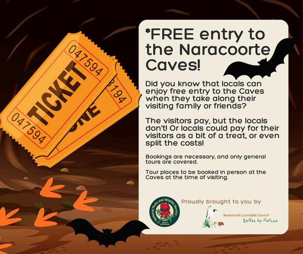 Organised as part of the Caves Connection Program, Naracoorte Lucindale Council residents bringing fee paying visitors to the park can accompany them on tours free of charge on a like for like basis. For example, if a family of four comes out with another family of four, the Naracoorte Lucindale Council residents can accompany their friends or family for free once their visitors have purchased a ticket. To take up this offer, local residents only need to show a Naracoorte Caves staff member a form of ID that lists their address when booking. If your visitors are booking online, please contact the Wonambi Fossil Centre on (08) 8760 1210 to put spots aside on the relevant tour
