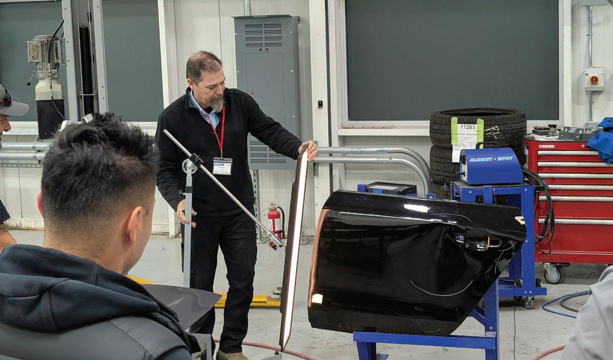 The format was simple by design. We set up stations across the shop: glue-pull dent repair, sanding and polishing systems, metal finishing, filler and feather-edge techniques, structural evaluation, spray-gun fundamentals and more.