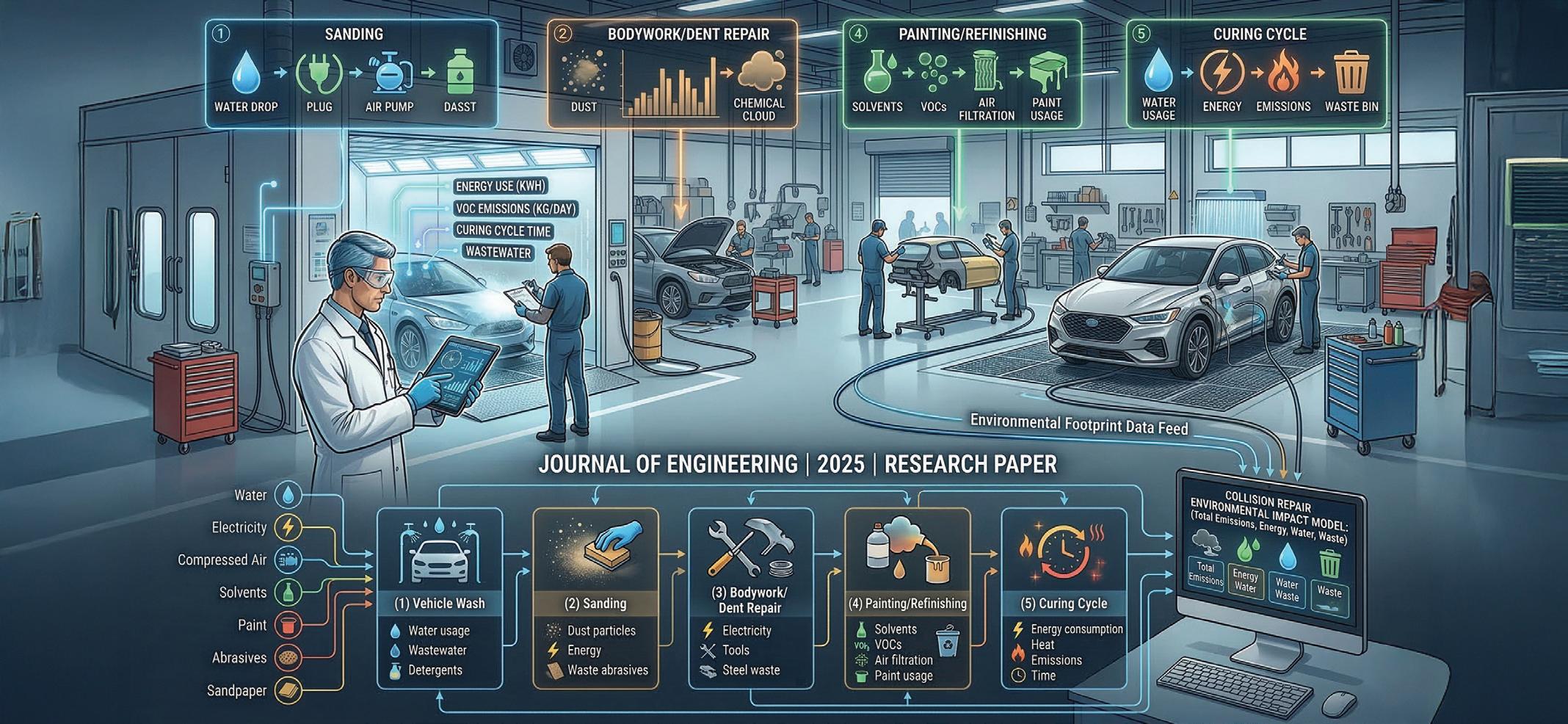 A new engineering model published in the Journal of Engineering (2025) transforms the traditional auto bodyshop into a data-driven environment. By breaking down every stage of the repair process — from initial washing and sanding to energy-intensive spray booth curing — researchers can now quantify the specific environmental footprint of each activity.