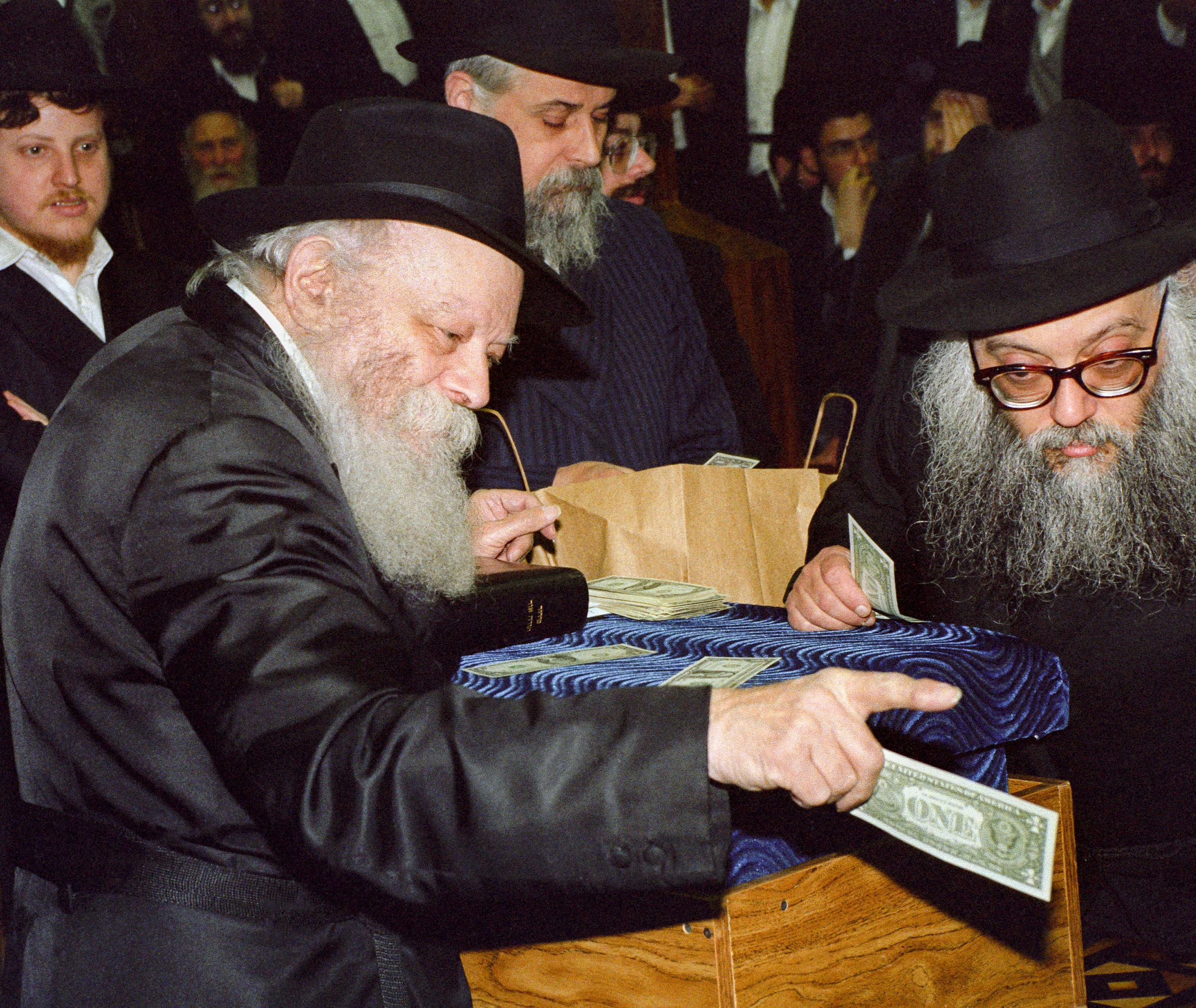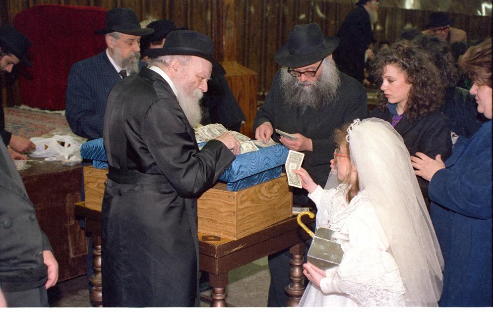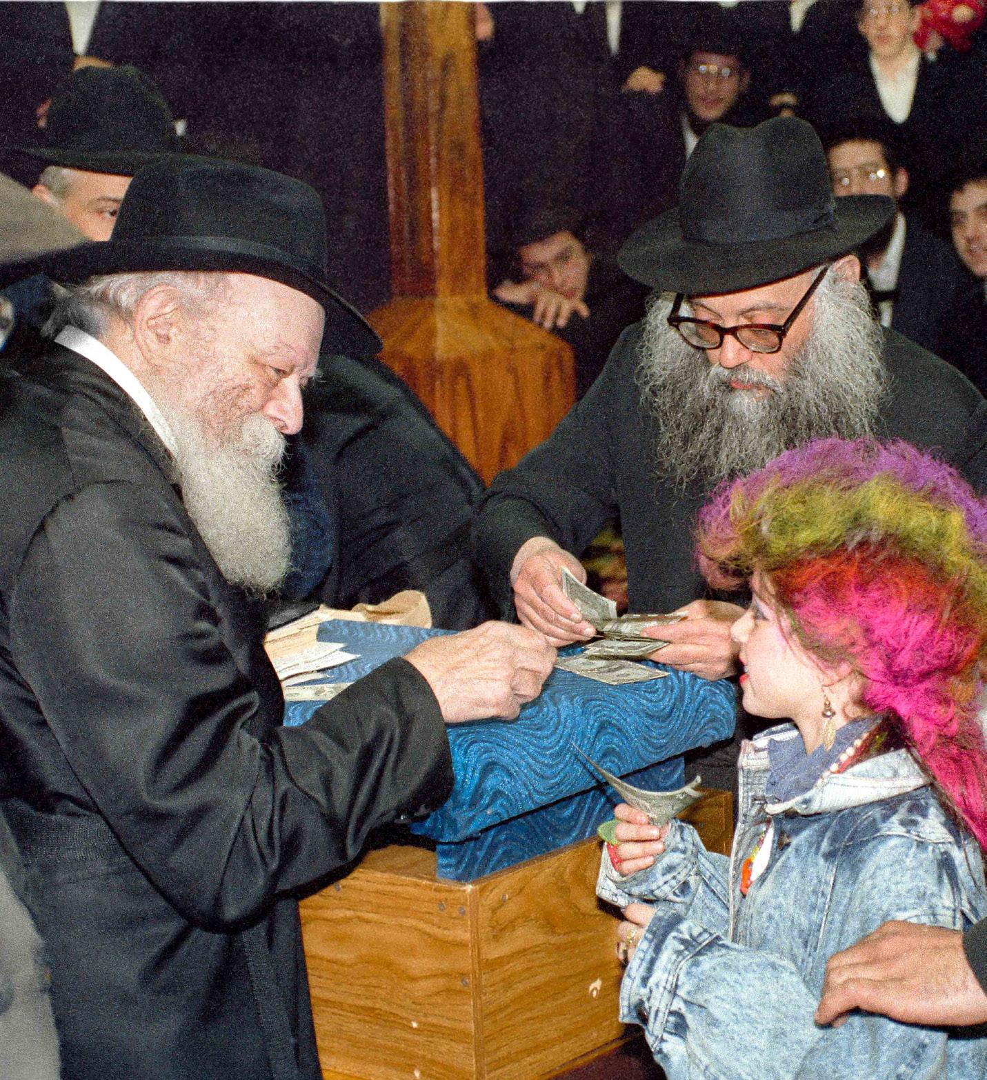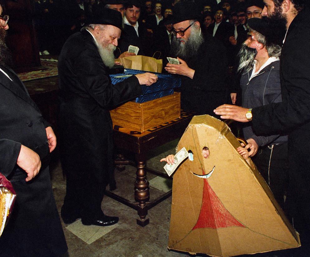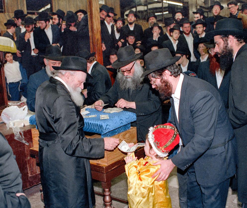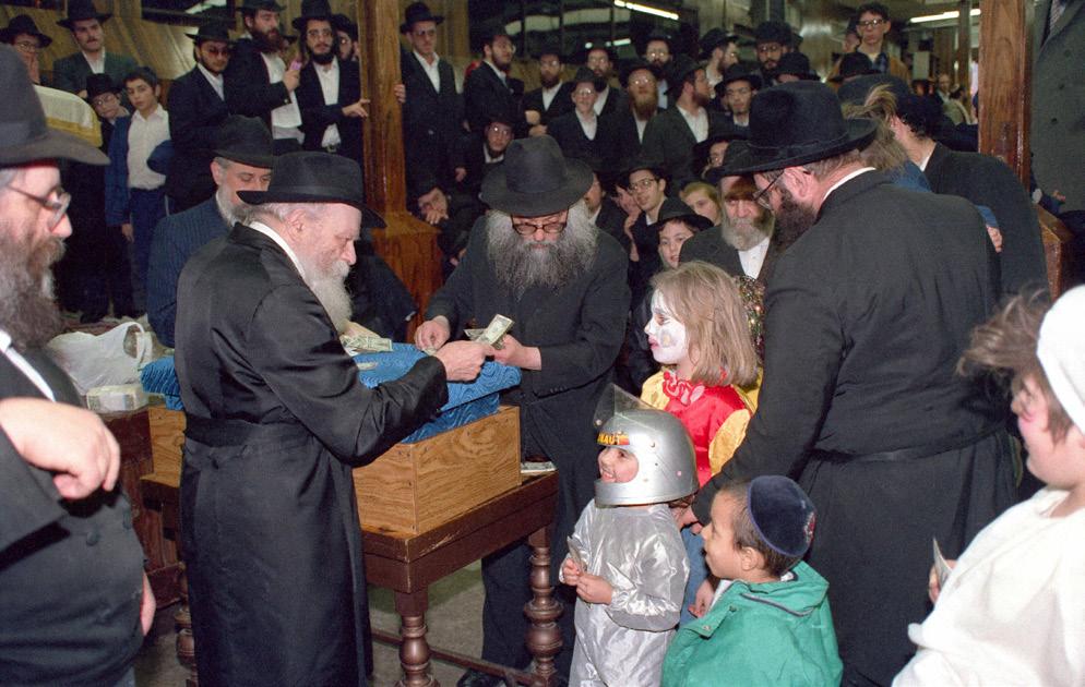 After Mincha on Purim day, the Rebbe gave out dollars. Throughout the distribution, the Rebbe encouraged the joyous singing and smiled to the many children who walked by in costume.