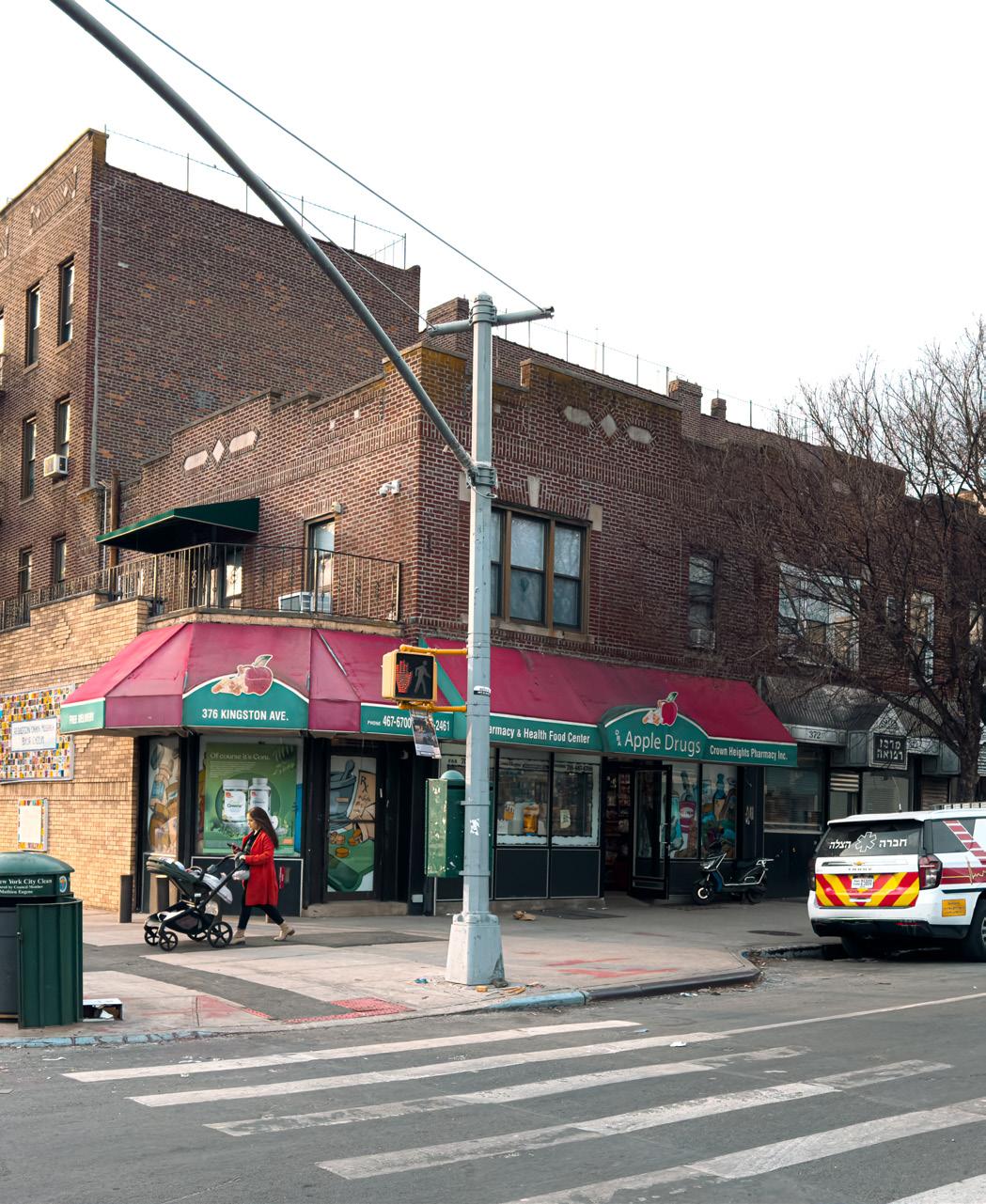 In the nineteenth century, the land where the beloved Crown Heights neighborhood pharmacy Apple Drugs now stands was part of the Jeremiah V. Spader estate. In 1921, as Kingston Avenue was being developed, David Eisenberg purchased adjacent lots on both sides of the corner of Crown and Kingston. He commissioned architects Shampan & Shampan to design a four-story apartment building at 481 Crown Street, and enlisted the New Age Construction Company (founded in 1912 by Samuel Caesar, Louis Rothman, and Harris Beackelman) to construct five buildings with storefronts and apartments along Kingston Avenue at a cost of $47,000.