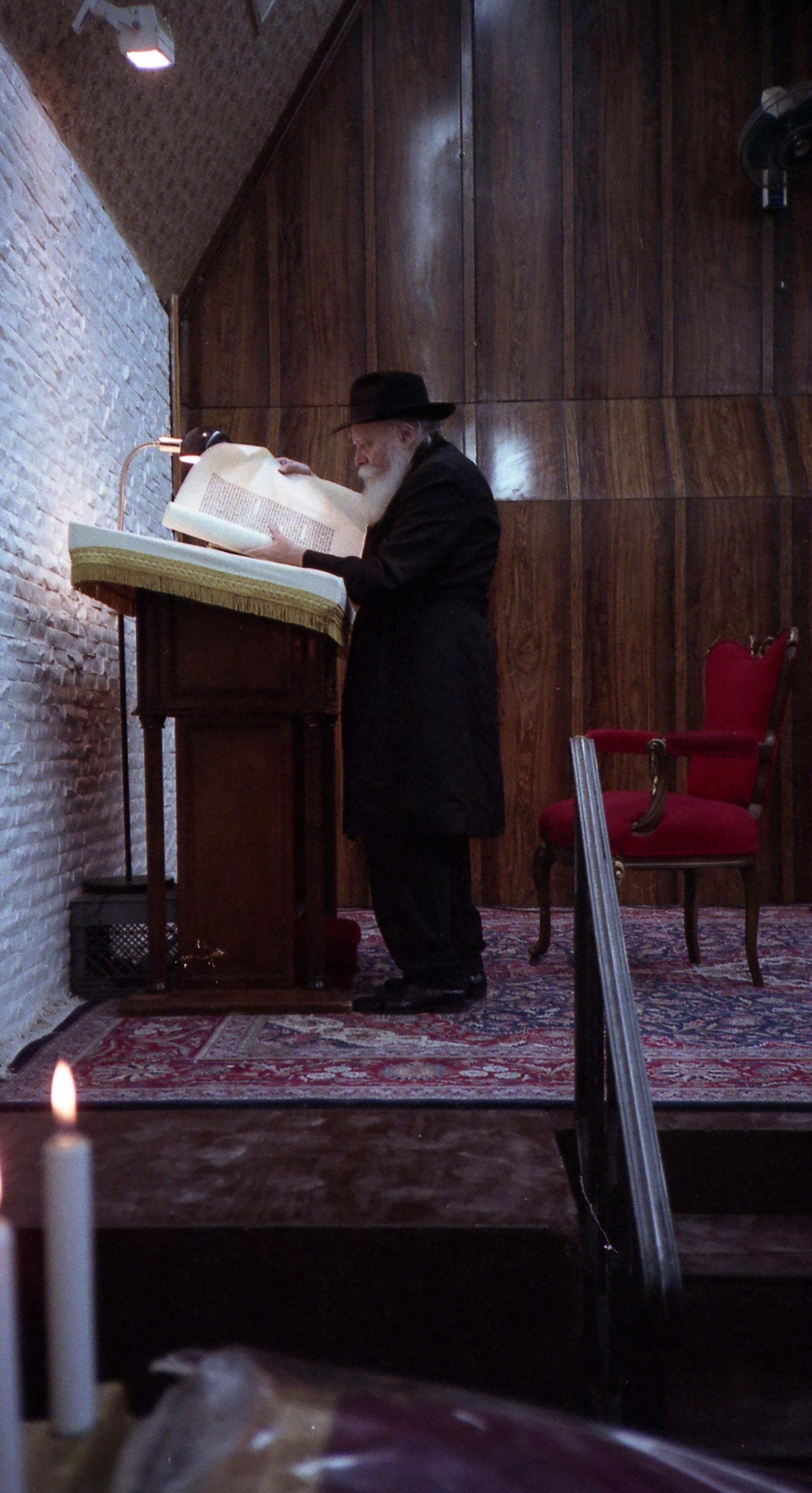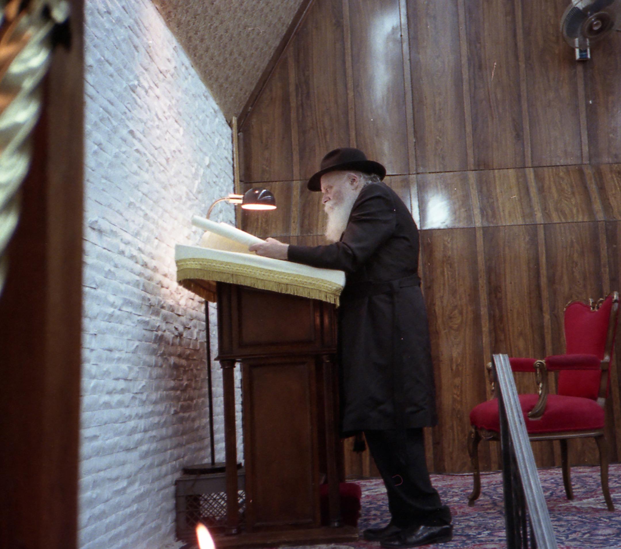 After Maariv, the Rebbe follows along during the reading of the Megillah