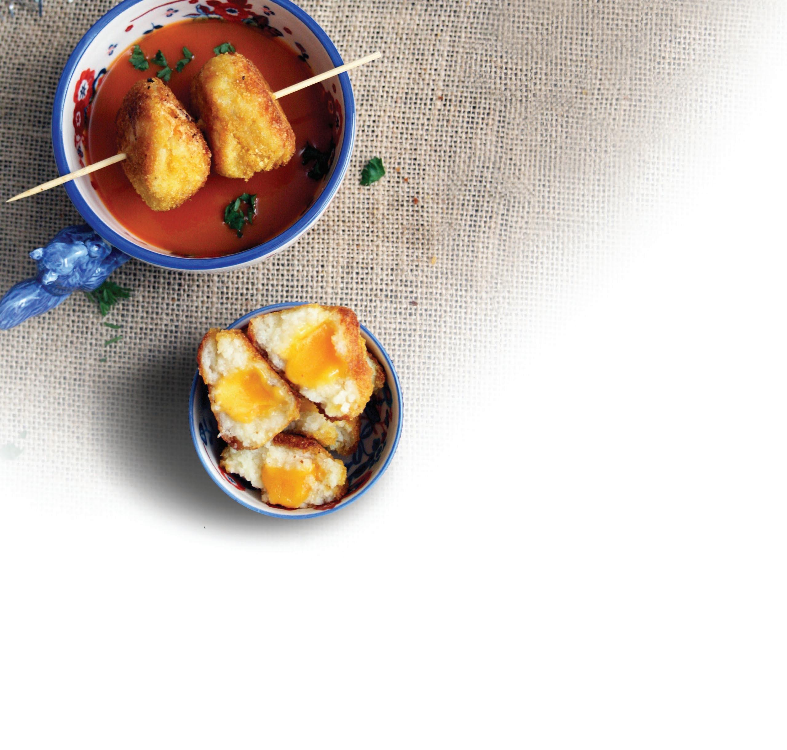 This here is my take on the classic comfort food combo of grilled cheese and soup, Chanukah edition! Crispy latke balls stuffed with creamy cheddar cheese served over savory roasted tomato soup.