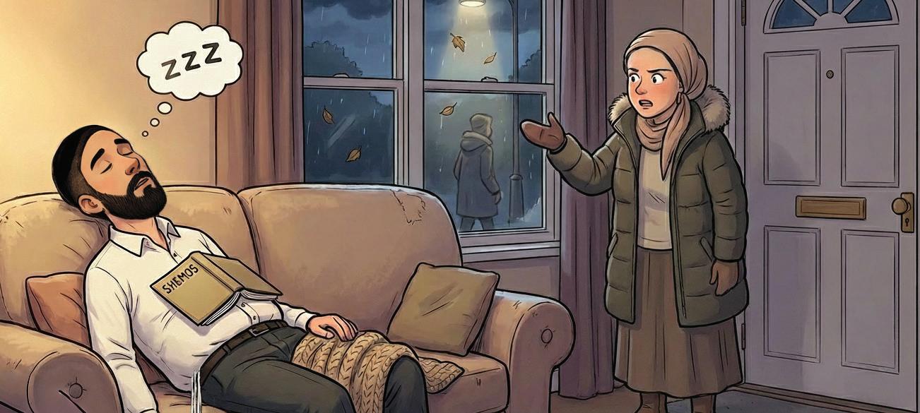 One way to get out of a long walk, at least, is to suggest a really close walking destination – a neighbor that you know that your wife can talk to for a reasonably long stretch of time until she feels like your walk has been long enough. And in the meantime, you can sit on their couch and fall asleep next to the husband (“Do you guys have a second Shemos?”), secure in the knowledge that no one can take a picture of this, and that no one will ever know for sure who the snores are coming from. If you fall asleep on your own couch after the seudah, you’re inconsiderate, but if you fall asleep on someone else’s couch, your wife will thank you for coming out with her.