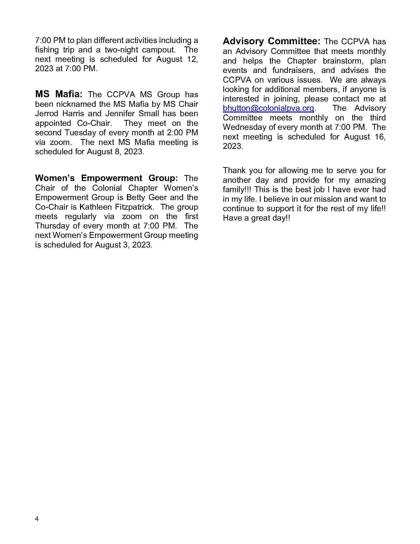 5 | Page NEW PVA PRESIDENT 29 TUSKEGEE AIRMAN MS WALK: ANNAPOLIS 26 Newsletter Editors: Ann Adair National Director & Vice President Brian Hutton Deputy Director Jerrod Harris Colonial Member STAY INFORMED UPDATE YOUR INFORMATION 302.861.6671 bhutton@colonialpva.org Email is the fastest way for the Colonial Chapter to communicate with our members. RECEIVE: News – Event Calendars – Special Offers - More 17