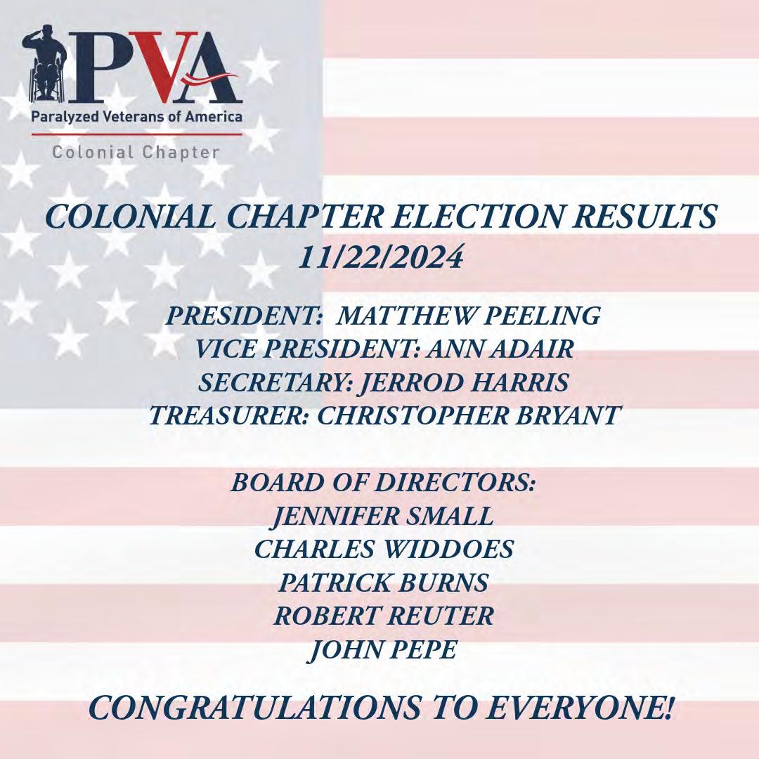 On behalf of the Paralyzed Veterans of America, Colonial Chapter, I would like to give a heartfelt THANK YOU to our members and volunteers for being an essential part of our chapter family. Our Chapter continues to lead in strengthening our community's foundation. As a mission-driven, charitable organization, we are dedicated to supporting our members and the disabled community through healthy living, philanthropy, and volunteerism. These focus areas reflect our commitment to our mission: to put principles into practice through programs that foster a healthy community.