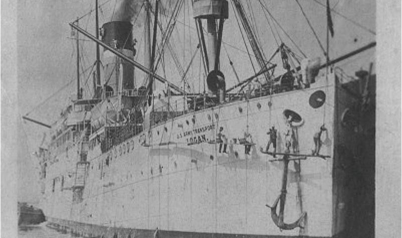 Ralph Smith returned to the U.S. from Siberia on the army transport Logan, shown here. He fought in the Russian Civil War. surely put the fear of God into the Bolsheviks around here. They are a fine-looking lot of fellows. These fellows fought their way through Russia against fearful odds and I think they should be congratulated. They were originally, as you know, in the Austrian army, but they promptly deserted to the allied cause and their capture meant instant death. I know one of their doctors and it is interesting to listen to him tell of their struggles against the Germans and Bolsheviks. My hat is off to them and I wish there were more like them. The Yanks are all in good health and all they crave is a little action but I guess our chance of seeing it is slight, for the Czechs have cleaned up pretty well. Well, Dad, I’ll close for this time and hit the hay. From your son, Ralph