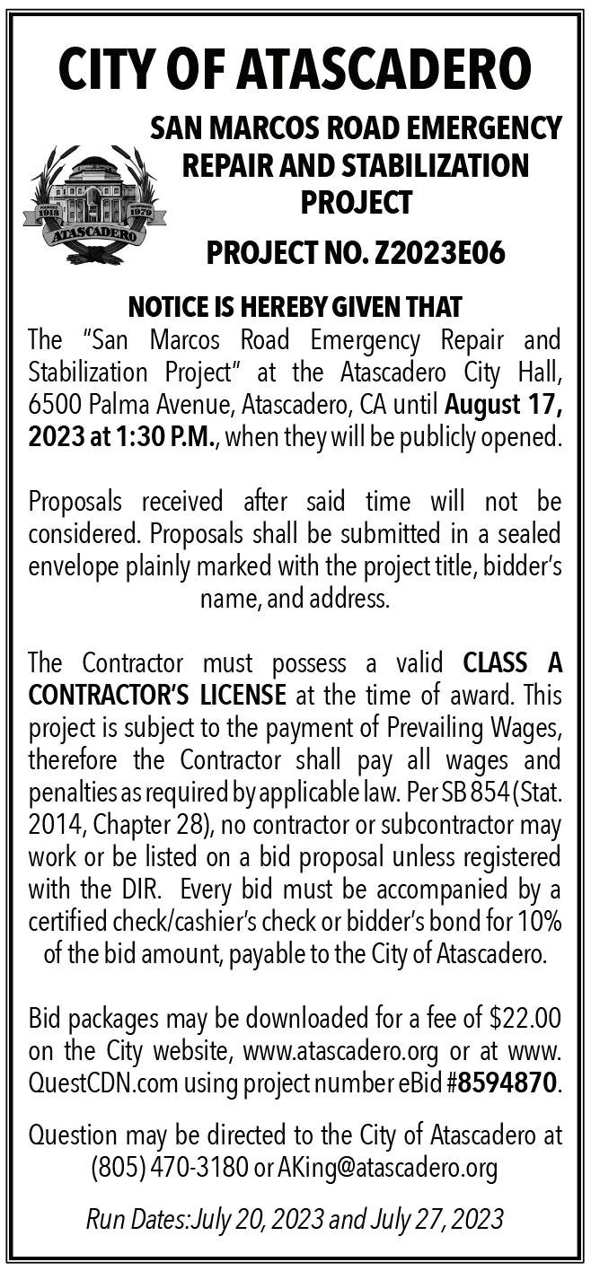 In addition, at the Supervisor’s meeting on Tuesday, July 18, the board approved a request to set a public hearing to consider collecting delinquent charges on the fiscal year 2023-24 County property tax bills for County Service Area No. 23 (Santa Margarita). The delinquent charges come to a total of $839.38. The Board of Supervisors will hold a public hearing on Aug. 8.