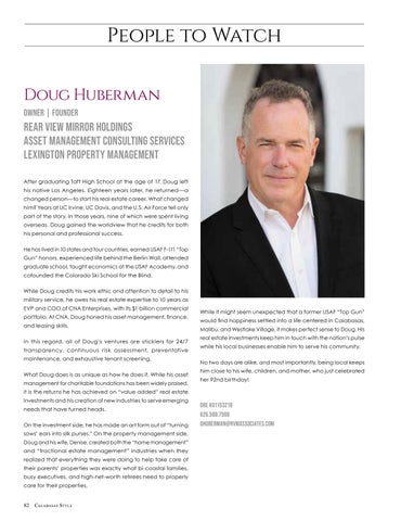Rear View Mirror Holdings Asset Management Consulting Services lexington property management After graduating Taft High School at the age of 17, Doug left his native Los Angeles. Eighteen years later, he returned—a changed person—to start his real estate career. What changed him? Years at UC Irvine, UC Davis, and the U.S. Air Force tell only part of the story. In those years, nine of which were spent living overseas, Doug gained the worldview that he credits for both his personal and professional success. He has lived in 10 states and four countries, earned USAF F-111 “Top Gun” honors, experienced life behind the Berlin Wall, attended graduate school, taught economics at the USAF Academy, and cofounded the Colorado Ski School for the Blind. While Doug credits his work ethic and attention to detail to his military service, he owes his real estate expertise to 10 years as EVP and COO of CNA Enterprises, with its $1 billion commercial portfolio. At CNA, Doug honed his asset management, finance, and leasing skills. In this regard, all of Doug’s ventures are sticklers for 24/7 transparency, continuous risk assessment, preventative maintenance, and exhaustive tenant screening. What Doug does is as unique as how he does it. While his asset management for charitable foundations has been widely praised,