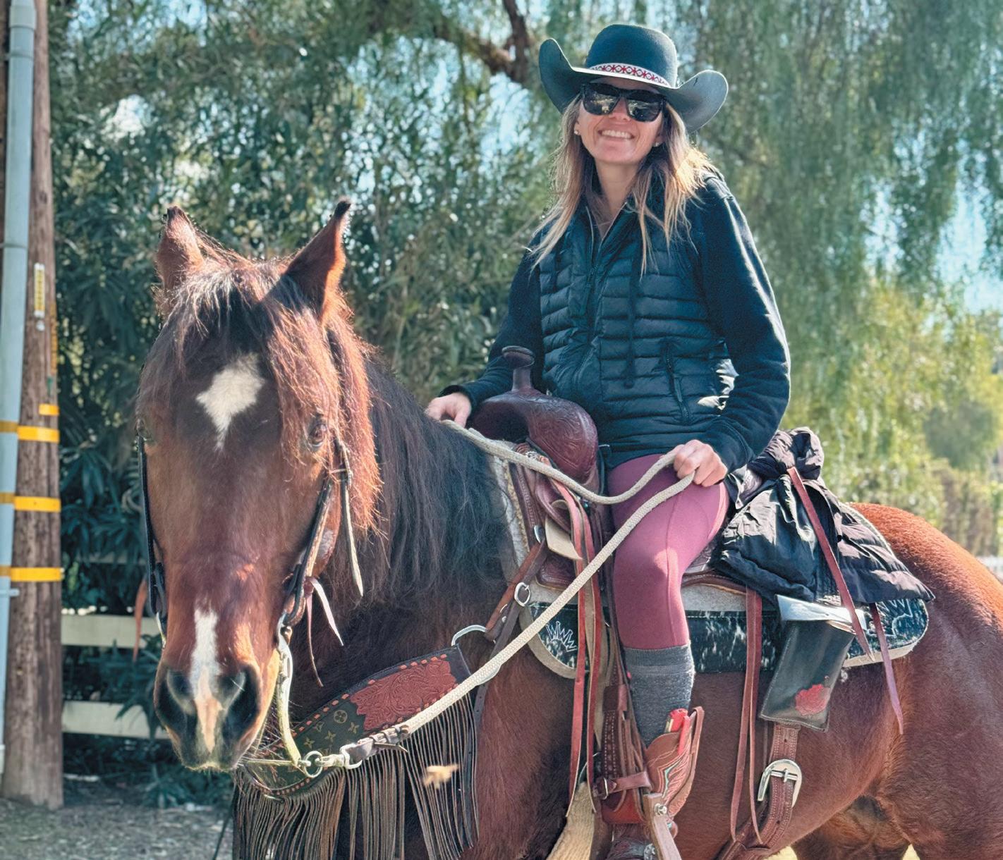 Lisa Christensen from the Equestrian Service Committee takes Bella Fuchs for a sunset ride.