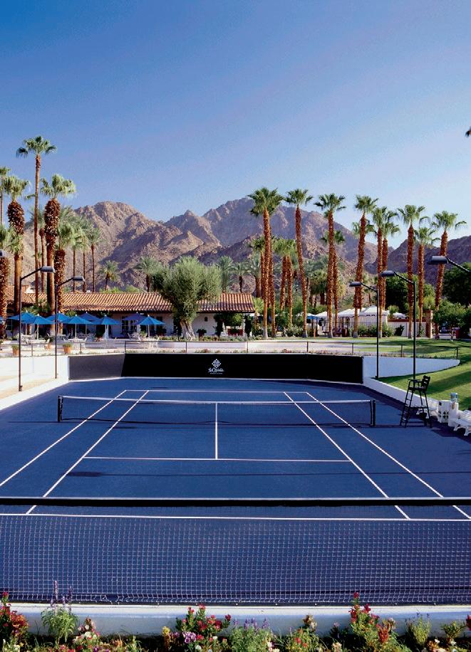 CLOCKWISE: MORGAN’S IN THE DESERT’S INVITING ENTRANCE. THE TENNIS CENTER COURT WITH THE SANTA ROSA MOUNTAINS IN THE BACKGROUND. ONE OF THE MANY RELAXING POOLS TO ESCAPE THE HEAT.