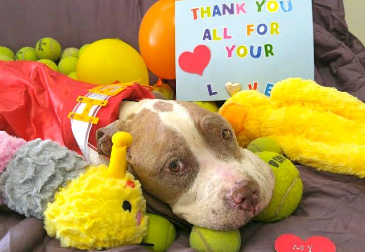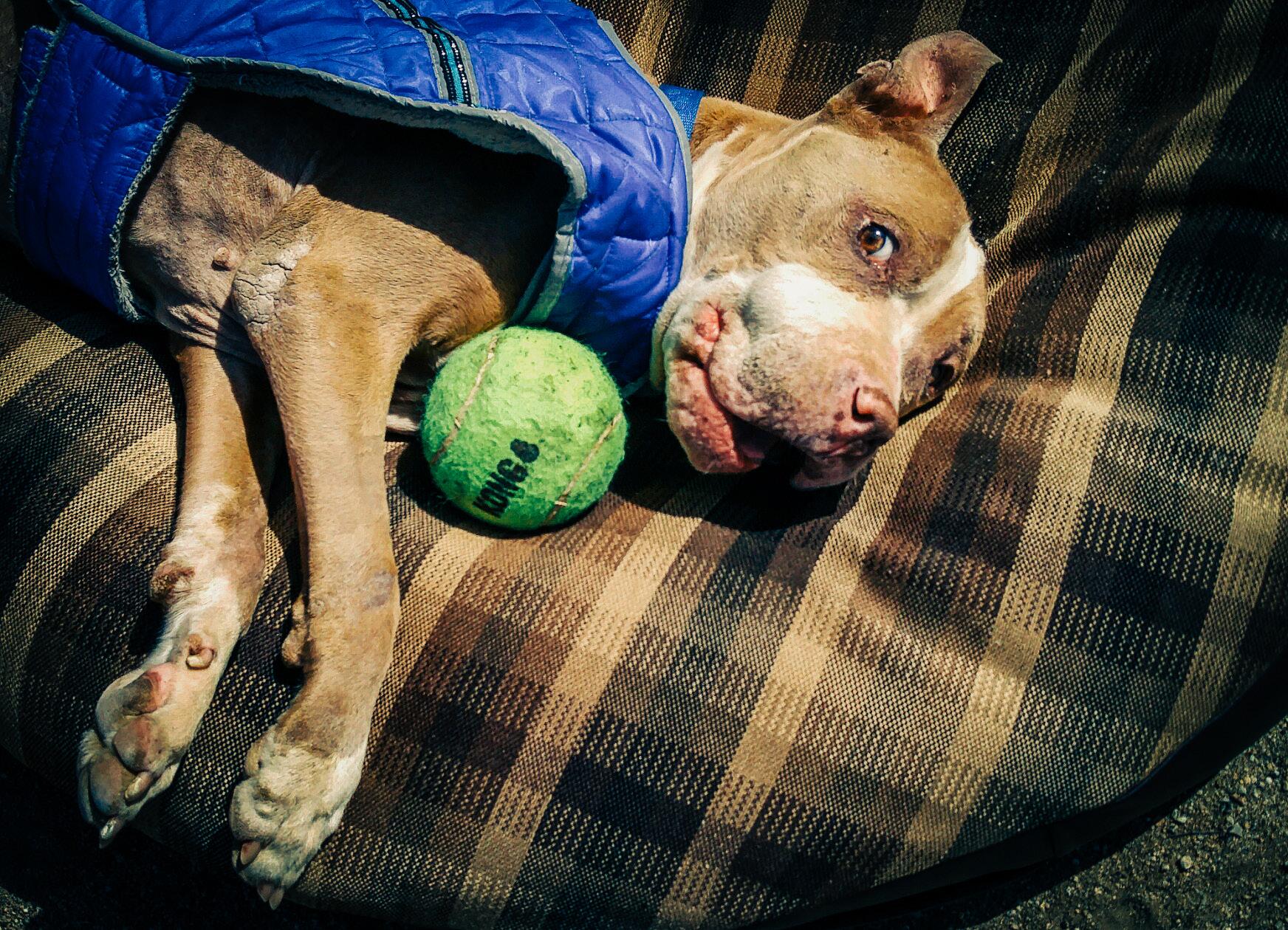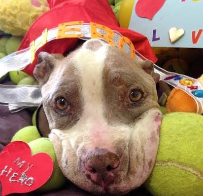 In early March 2016, the pit bull we named “HERO” was found by a Good Samaritan on the streets of Riverside. This despondent boy had been starved; he was all skin and bones and severely dehydrated. He had been wrongly cast away, most likely because of what he looked like. He was taken to the Riverside shelter