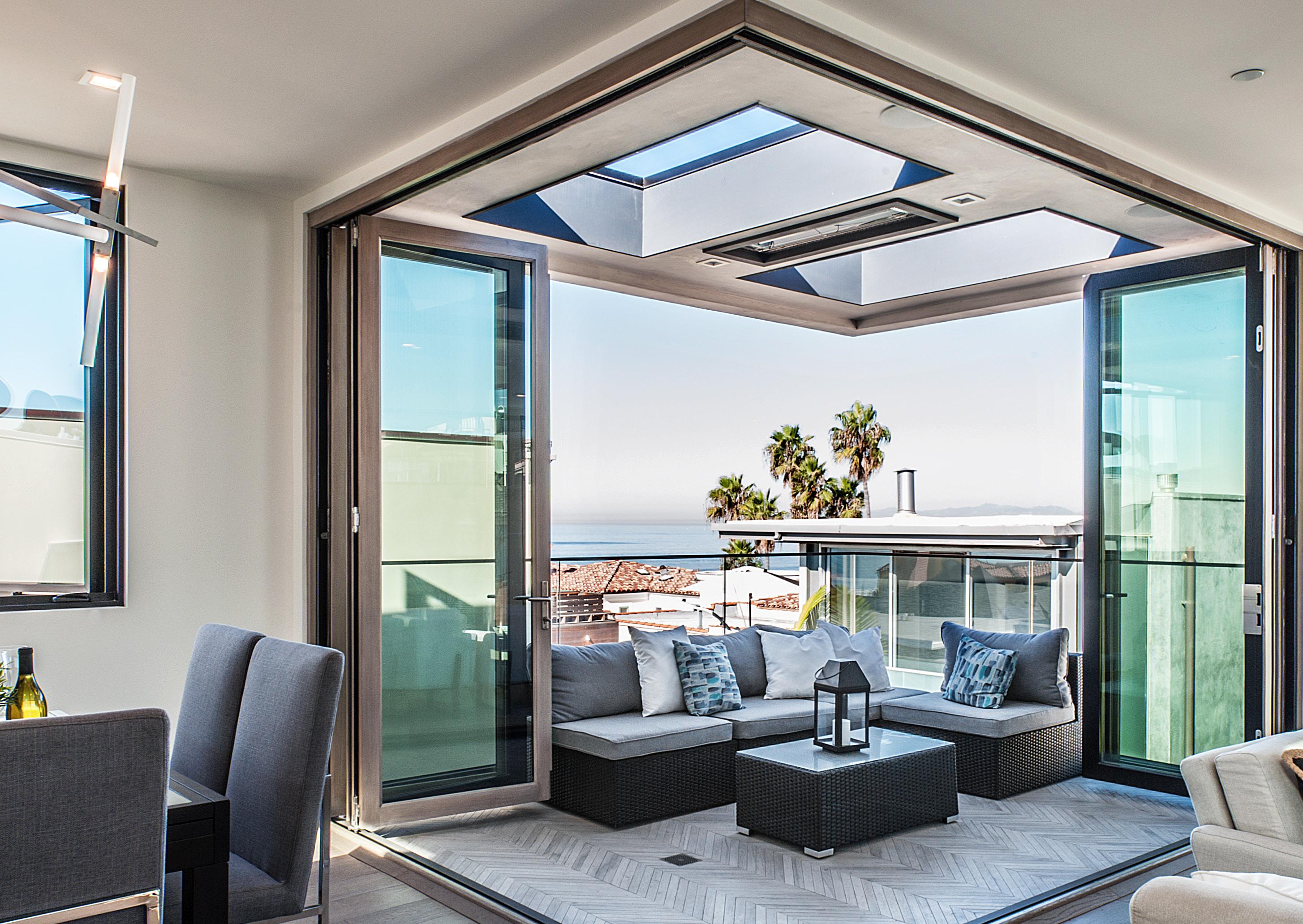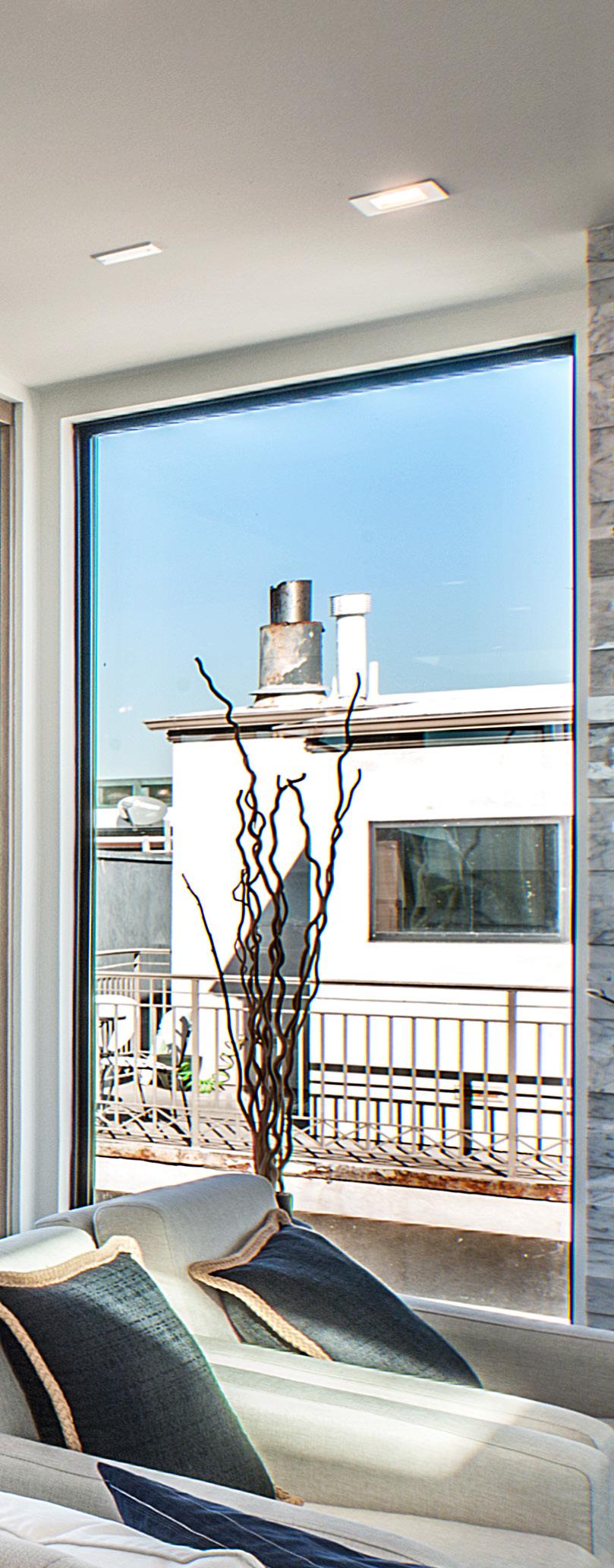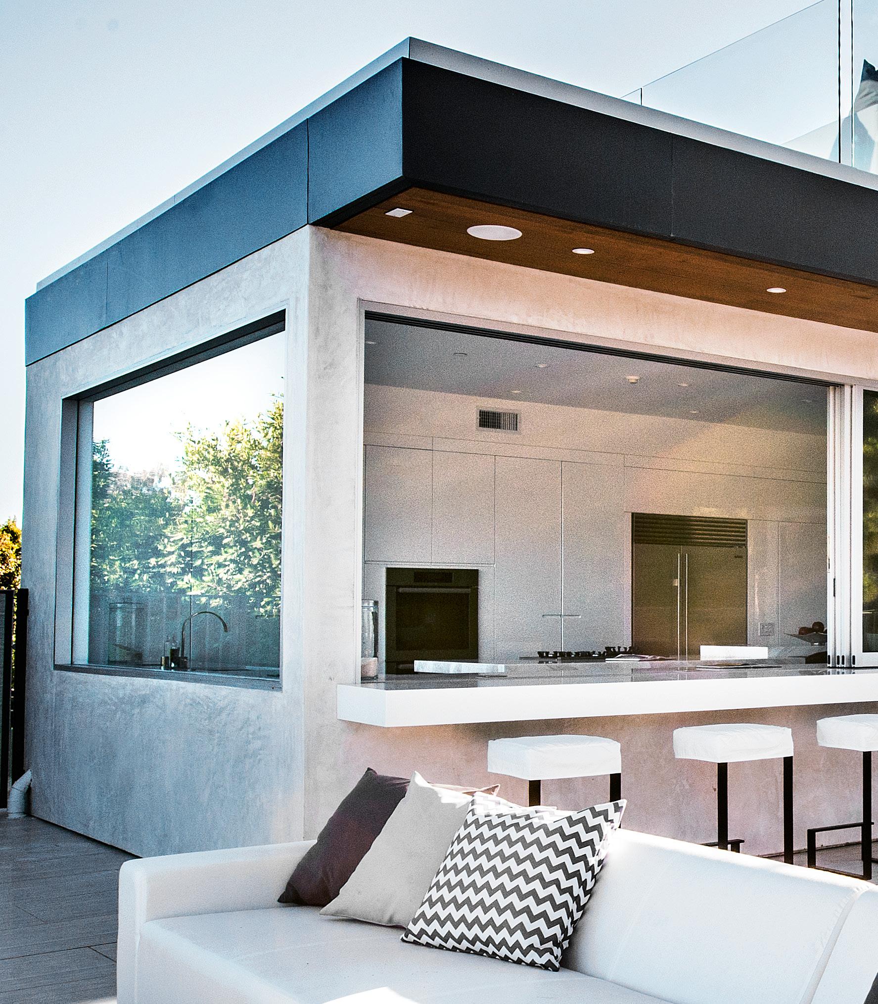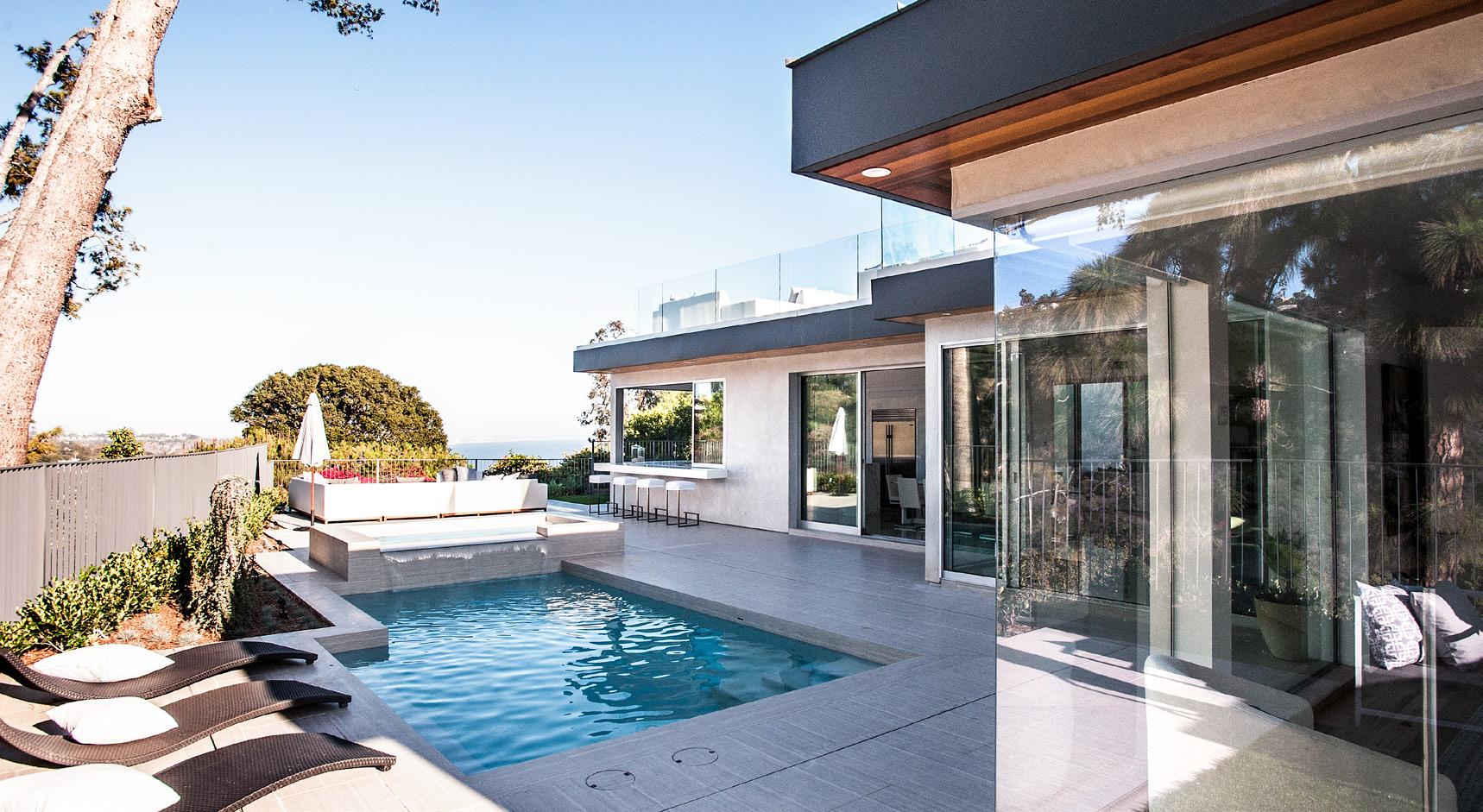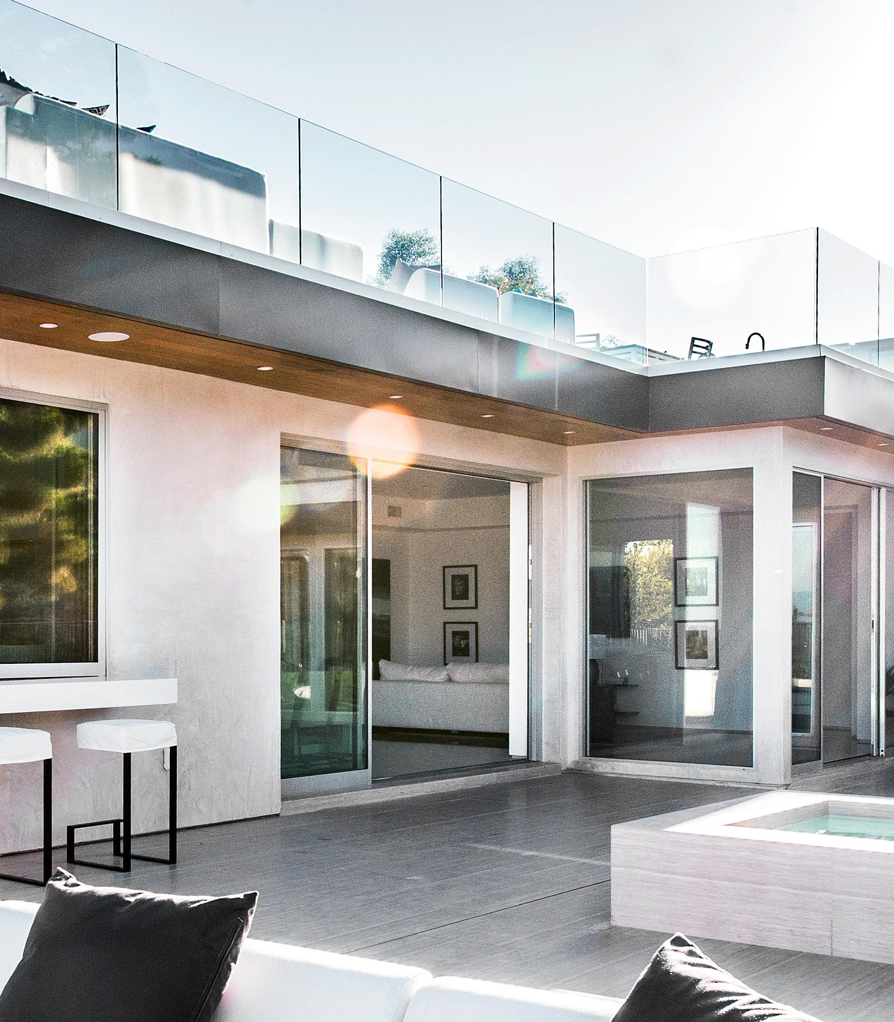 LEFT: VIEW OF THE PACIFIC OCEAN FROM THE LIVING ROOM OF A MANHATTAN BEACH RESIDENCE, DESIGNED AND BUILT BY KASSABIAN. BELOW: SINGLE-STORY CUSTOM RESIDENCE IN PACIFIC PALISADES WITH A ROOF-TOP DECK AND OCEAN VIEW