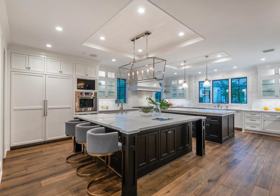 “The home today is built around the ‘great room’ rather than the compartmentalized home design from 10 or 15 years ago, broken down into many smaller rooms,” he continues. “The kitchen opens out to the family room and a breakfast area, sometimes with double islands (for food prep and entertaining). Several of my clients want to see better proportions between the first and second floors. As there are more home businesses, clients are asking for large, beautiful offices that are visible from the street. Closet rooms are still popular, but rather than having one