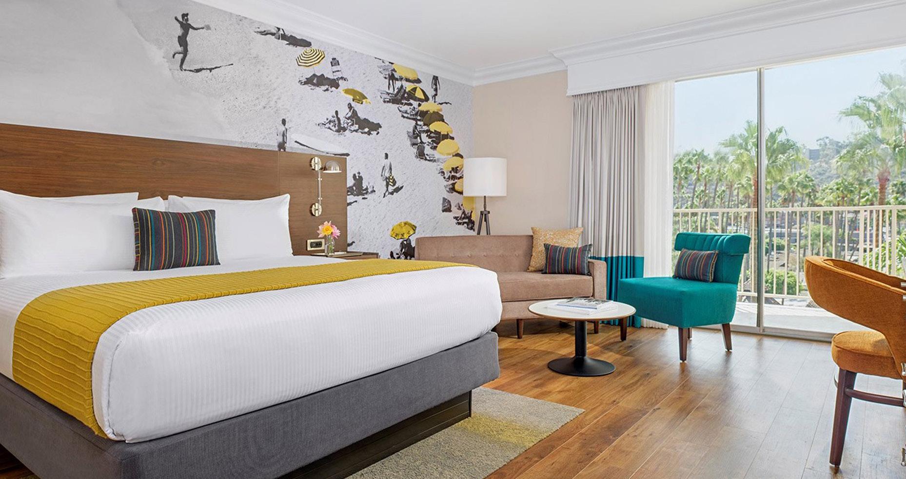 After a multi-million dollar remodel by noted architecture/design firm Gensler, Town & Country Resort’s management boldly reopened late this summer, reintroducing even the most travel-weary to a mid-century vacation experience...albeit one with a few new 21st Century features (WiFi, in-room Keurig machines) and essential safety protocols allowing visitors to indulge with full peace of mind. All 675 guest rooms and suites are fully renovated, yet transport guests back a few decades with a lively color scheme and elements such as a retro record player and an assortment of vinyl records. There are other nice touches evoking San Diego’s enduring status as an all-American vacation destination, such as artworks by local artists Andy Davis and Mark Warren Jacques gracing public areas throughout the resort.