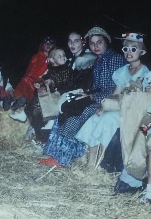 Jo Mitchell laughing with friends. Mary Lee Lindquist with family and horses in the 60s.