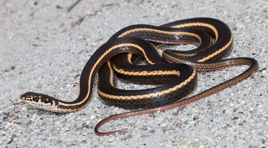 APPEARANCE: A long fast-moving snake with a thin body and a long thin tail, large eyes, a broad elongated head, a slender neck, and smooth scales. Dark olive brown, gray, or black ground coloring with a pale yellow or cream colored solid stripe on each side which extends from the back of the eye to or beyond the vent. The stripes are relatively narrow. The underside is cream or pale yellow tapering to pink toward the tail.