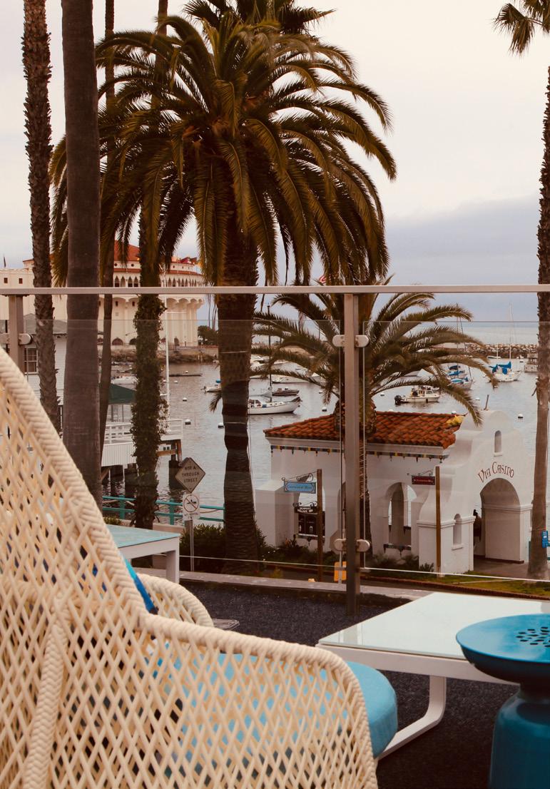 Ocean and aquamarine blues mingle with seafoam and kelp greens are inspired by Catalina Island’s natural assets and framed with black, white and timbor wood accents. Although the aesthetic and the hotel’s new name are described as “nautical” by the designers, it’s neither kitschy nor cliché, with use of hand molded tiles, custom art pieces, and blue tie-die flourishes, especially in its 40 rooms and suites. The remodeled guest-only rooftop, meanwhile, takes full advantage of the oceanfront scenery and sunsets with the addition of a glass railing, lighting, and Rooftop Lounge that brings a touch of a luxury cruise or yacht feel into the stay. Other lounge areas in the public spaces, indoors and outdoors, are home-y yet clean and contemporary.