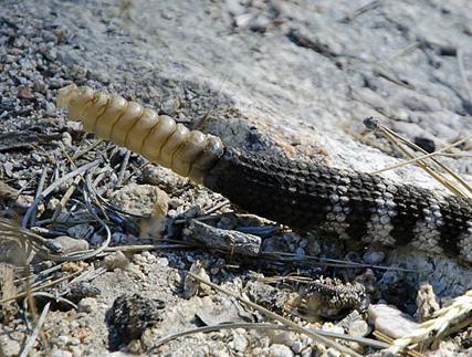 APPEARANCE: A heavy-bodied pit viper, with a thin neck, a large triangular head, and a rattle on the end of the tail consisting of loose interlocking hollow segments. A new rattle segment is added each time the skin is shed, which can be more than one time per year. Pupils are elliptical. Scales are keeled. Young are born with a bright yellow tail with no rattle - just a single button which does not make a sound. They grow rattles and lose the yellow color as they age. The pattern is brighter on juveniles than on adults.