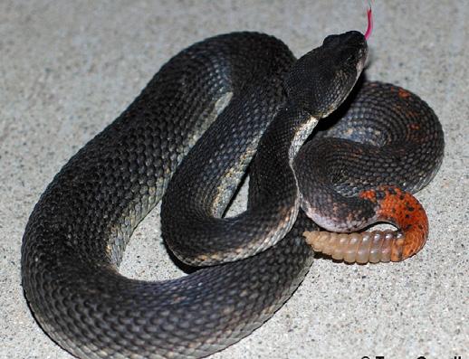 line of defense is to remain motionless; if you surprise them or cut off their retreat, they offer an audio warning; if you get too close, they head for cover. Venom is intended for prey so they’re reluctant to bite, and 25 to 50 percent of all bites are dry - no venom is injected.”