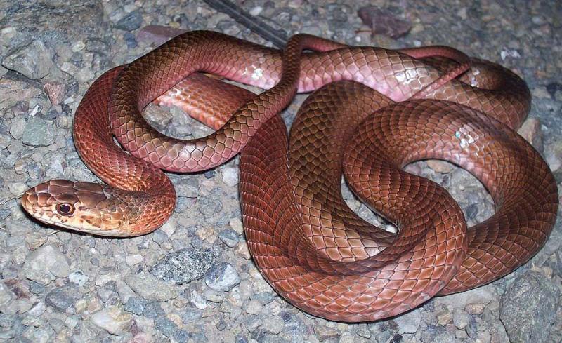 APPEARANCE: A slender fast-moving snake with smooth scales, a large head and eyes, a thin neck, and a long thin tail. (There is no well-defined stripe lengthwise on the body in this species.) The braided appearance of scales on the tail (like a whip) gives this species its common name. Color is variable; light brown, pink or reddish above. The dark coloring is interspersed with light coloring creating a banded or saddled appearance, with dark coloring surrounding the light scales. Dark (often black) blotches across the top of the neck, sometimes with white, sometimes with body color, in between. (Sometimes the neck and much of the head are solid black.) Color typically changes to a solid tan or reddish coloring along the length of the long thin tail.